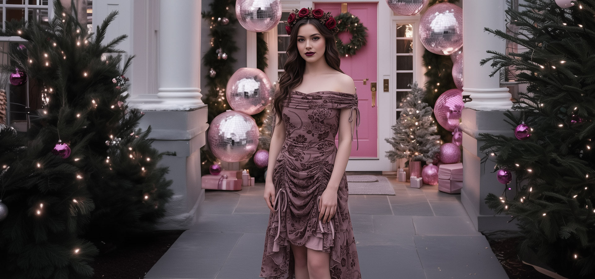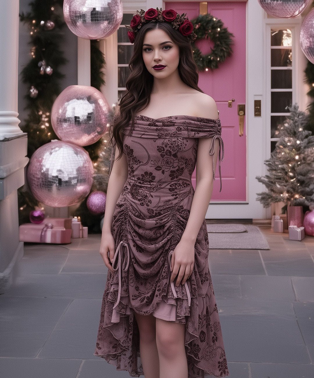 Gothic Cold Shoulder Rose Flower Leaf Flocking Ruched Buckle Grommet A Line Dress