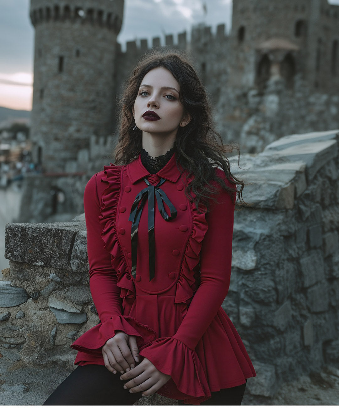 Gothic Bowknot Velvet Embossed Lace Trim Hook and Eye Frog Buttons A Line Dress