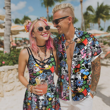 Gothic Plus Size Skull Tropical Leaves Floral Print Hawaii Button Pocket Shirt For Men