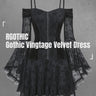 Gothic Flare Sleeve Cold Shoulder Floral Lace Mesh Flocking Velvet Patchwork Ruched A Line Cami Dress(3 Days Delivery)