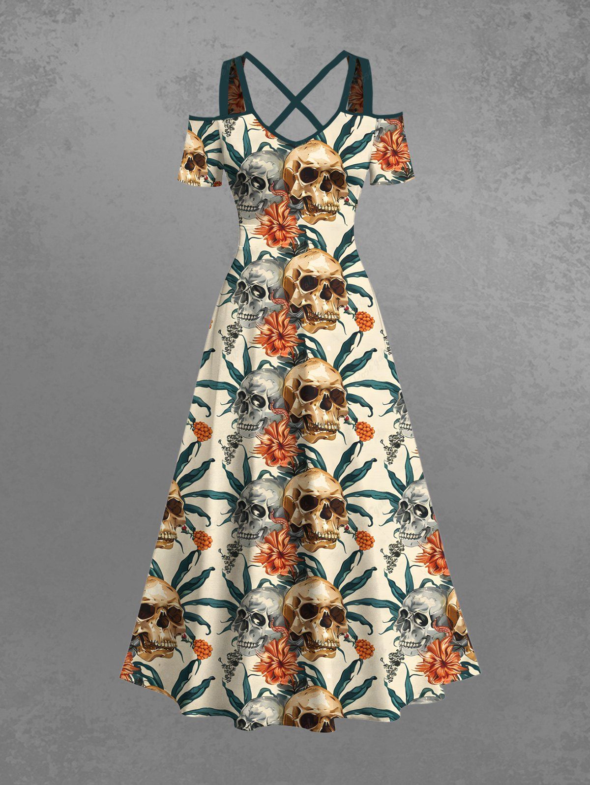 Gothic Plus Size Skulls Flowers Leaf Print Cold Shoulder Crisscross Maxi Dress