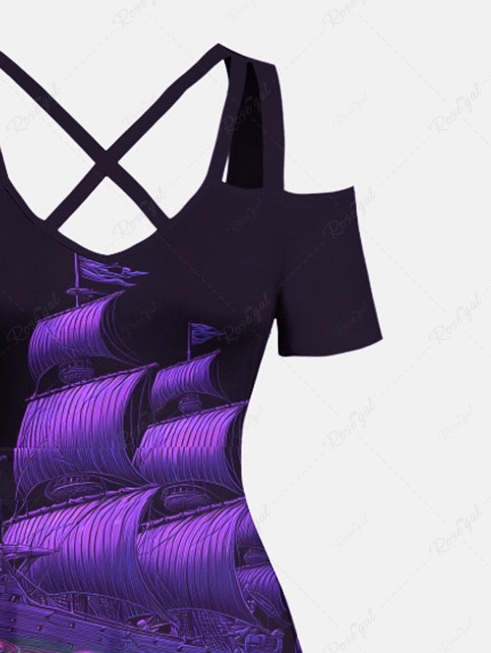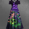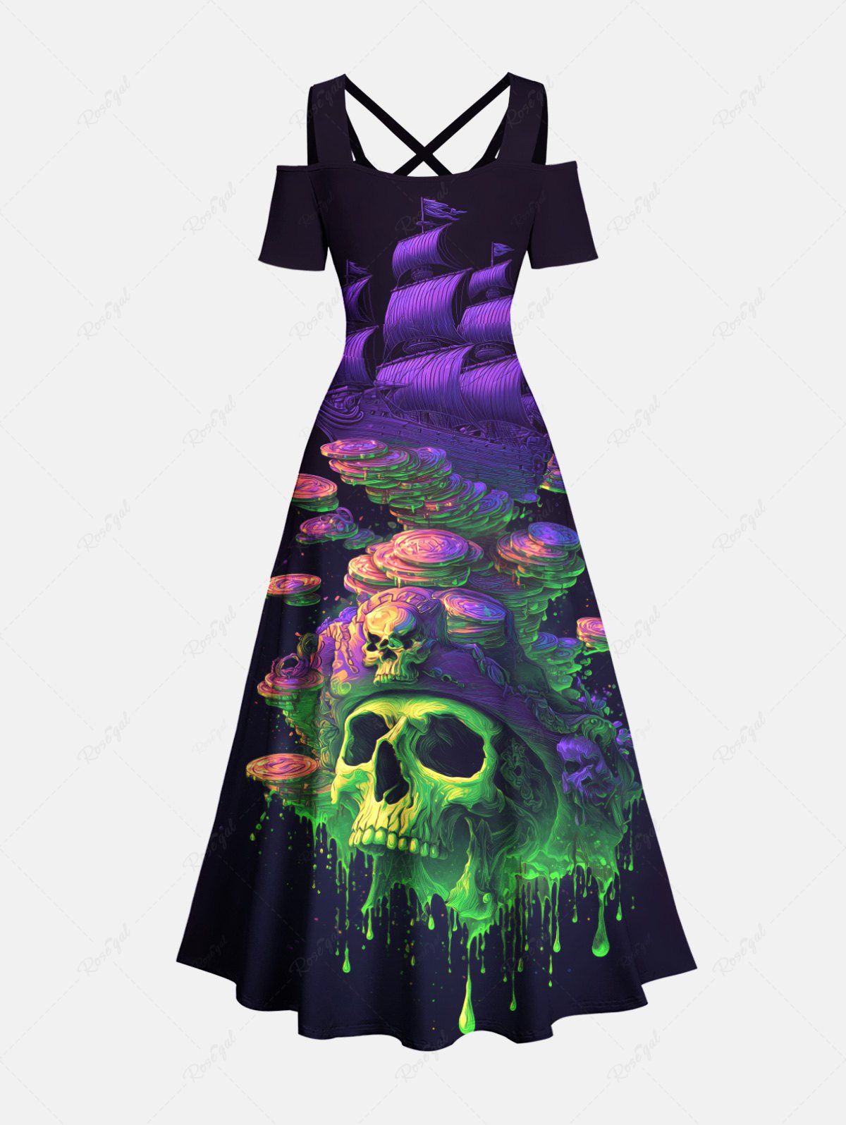 Gothic Plus Size Skulls Coin Boat Paint Drop Print Cold Shoulder Crisscross Maxi Dress