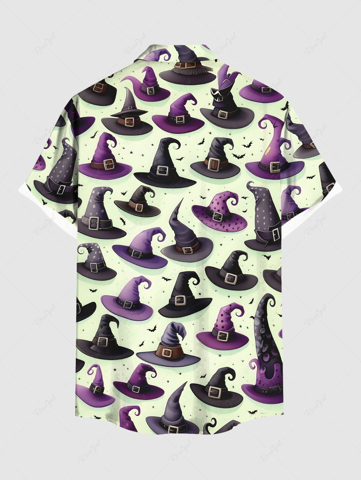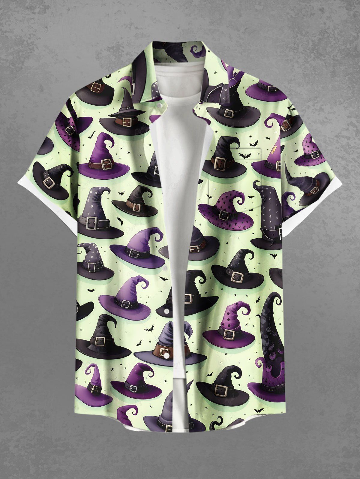 Gothic Plus Size Wizard Hat Bat Print Halloween Button Pocket Shirt For Men