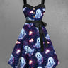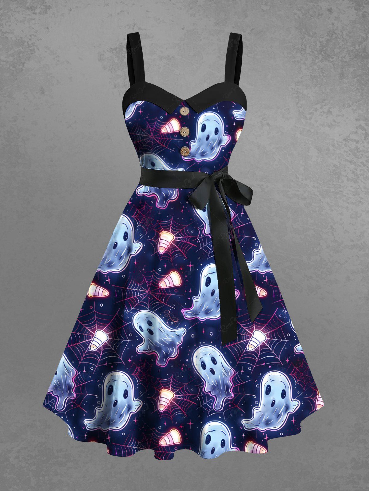 Gothic Plus Size Ghost Spider Web Galaxy Print Halloween Button A Line Dress with Removable Belt