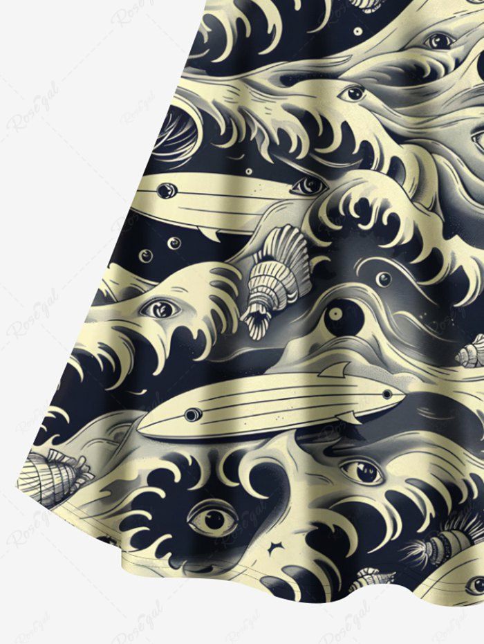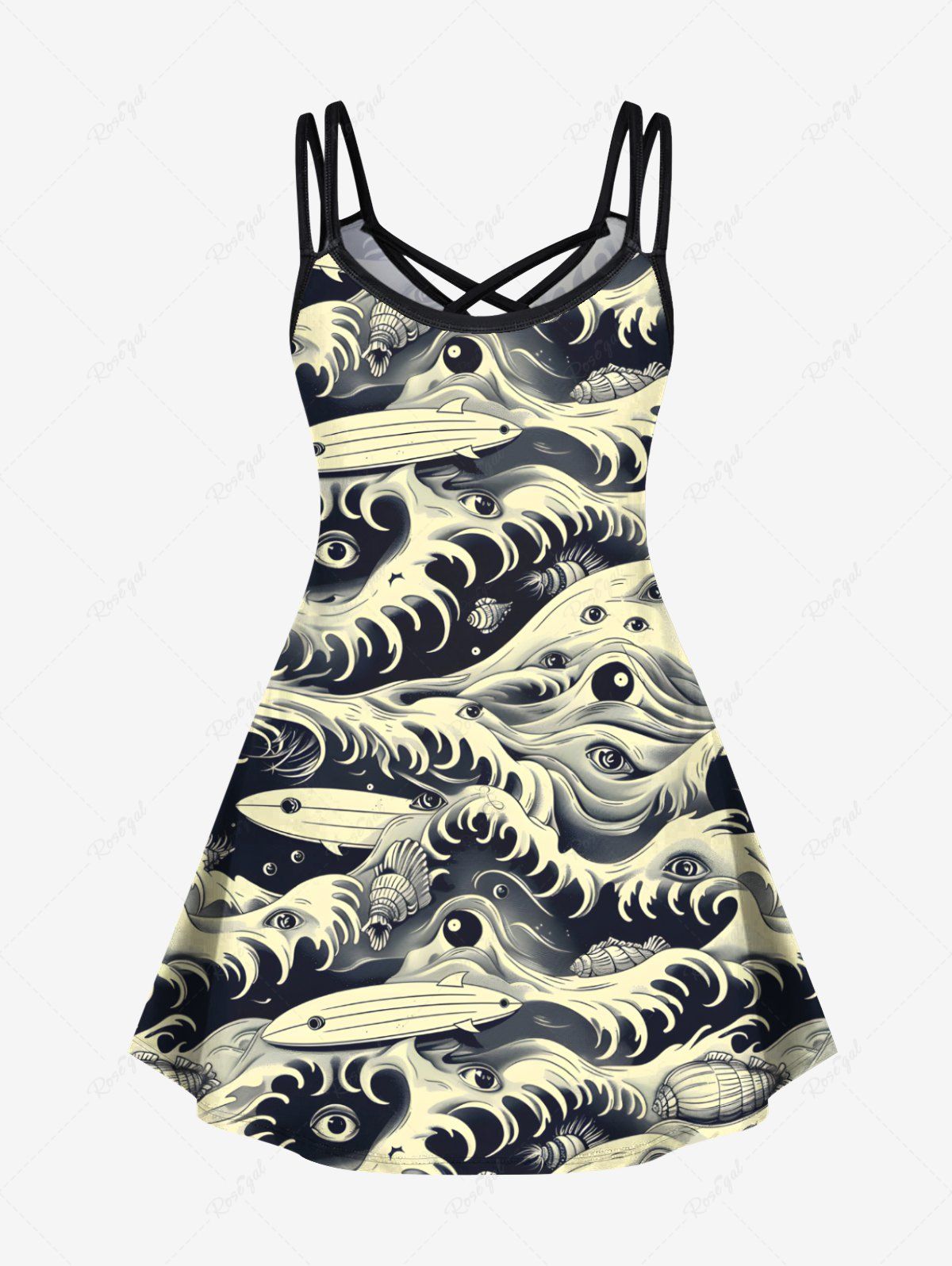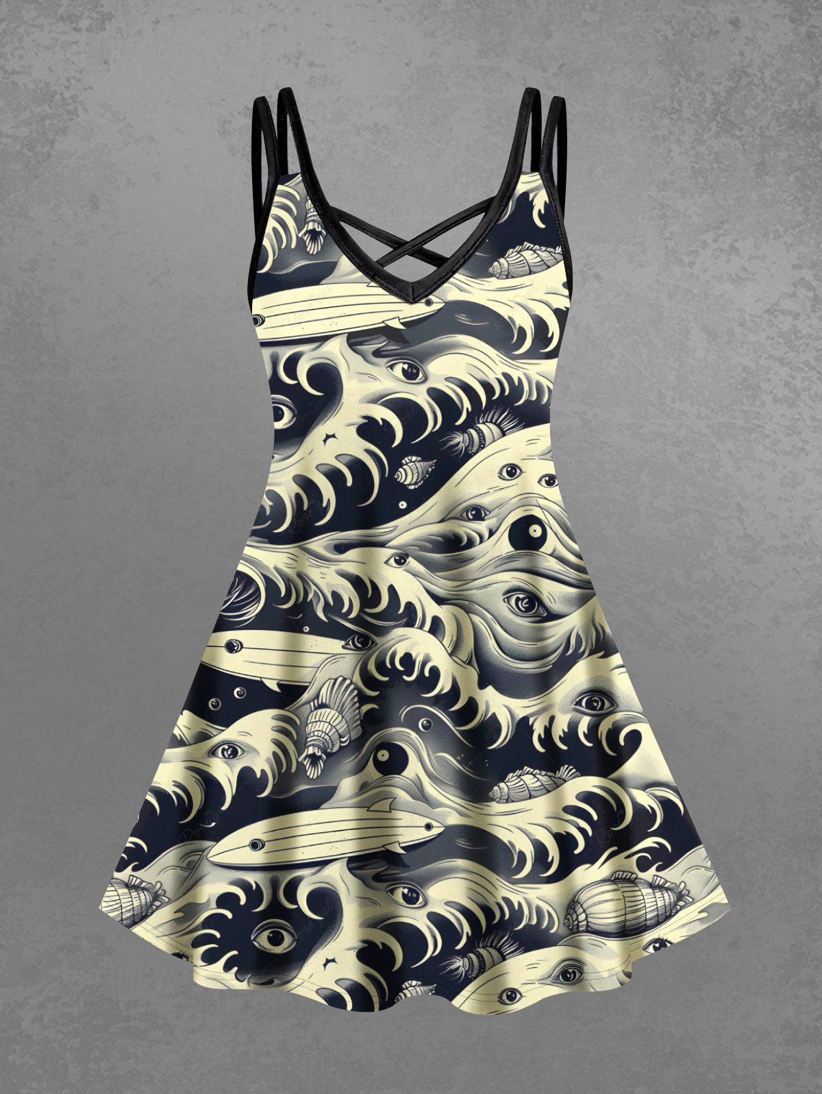 Gothic Plus Size Halloween Sea Waves Eyes Sharks Print Crisscross Cami Dress