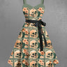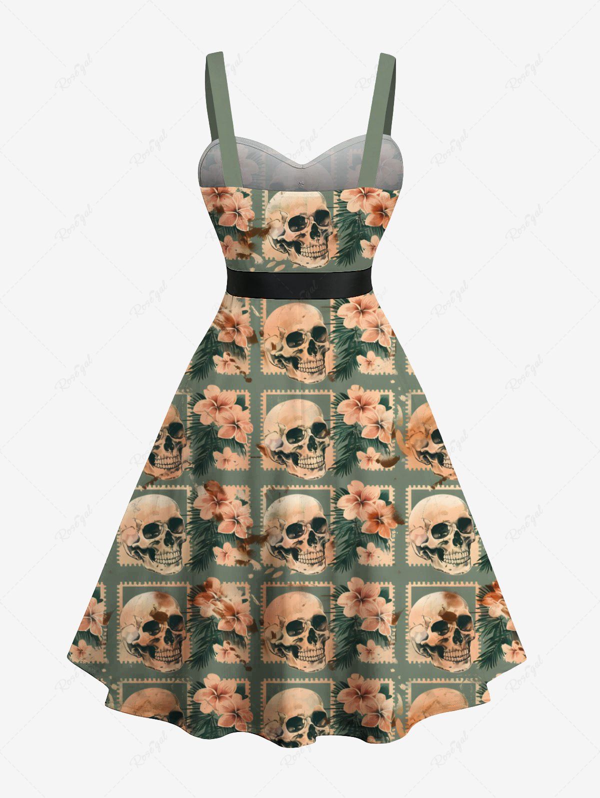 Gothic Plus Size Skull Hibiscus Flower Tropical Leaf Geometric Print Hawaii Button A Line Dress with Removable Belt