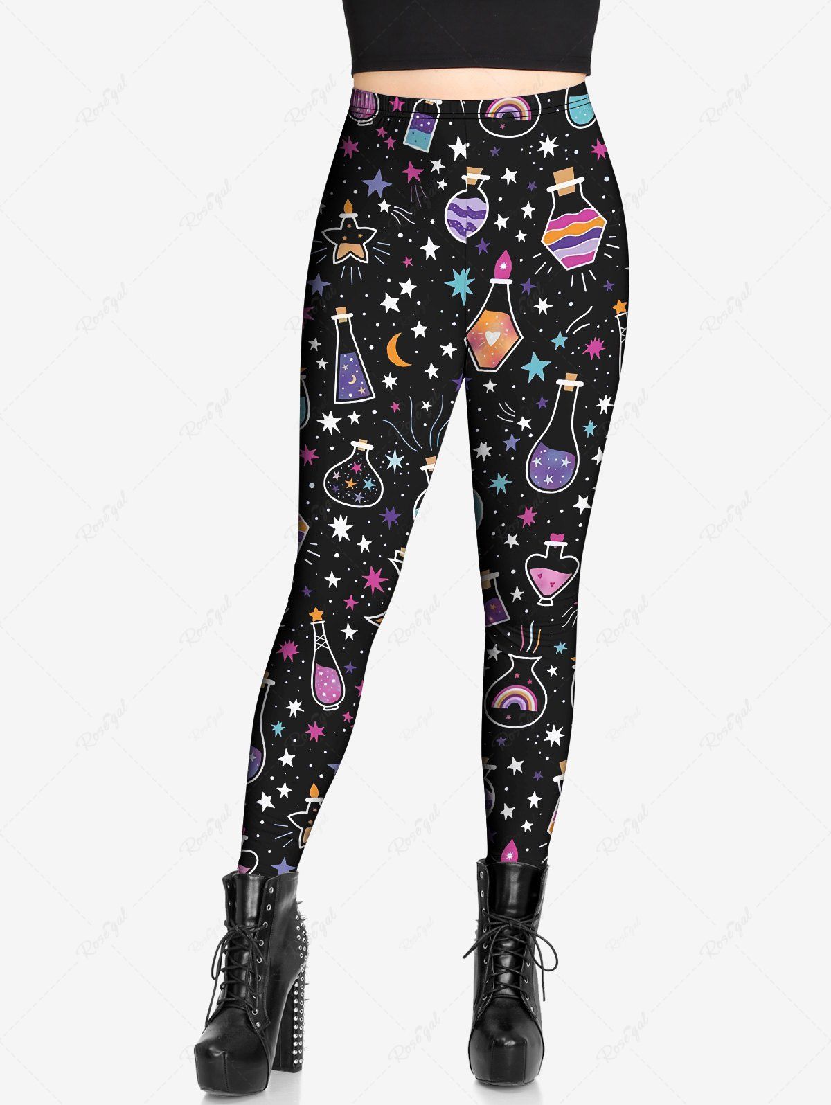 Gothic Plus Size Colorful Star Moon Striped Bottle Heart Candle Print Skinny Leggings
