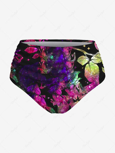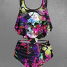 Gothic Plus Size Skull Colorful Glitter Ombre Leaf Print Peplum Hem Backless Tankini Swimsuit (Adjustable Shoulder Strap)