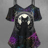 Gothic Plus Size Moon Cat Colorful Floral Glitter Print Cold Shoulder Cami T-shirt