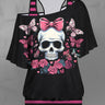 Gothic Plus Size Striped Print Racerback Tank Top and Skull Butterfly Bowknot Rose Flower Leaf Graphic Skew Neck Valentines T-shirt Set