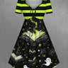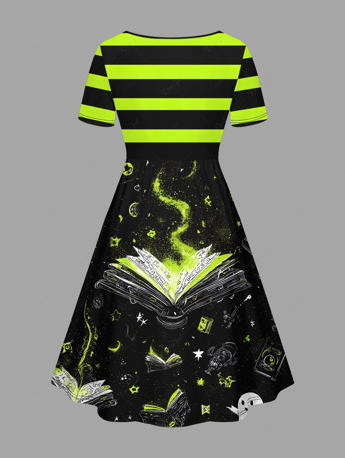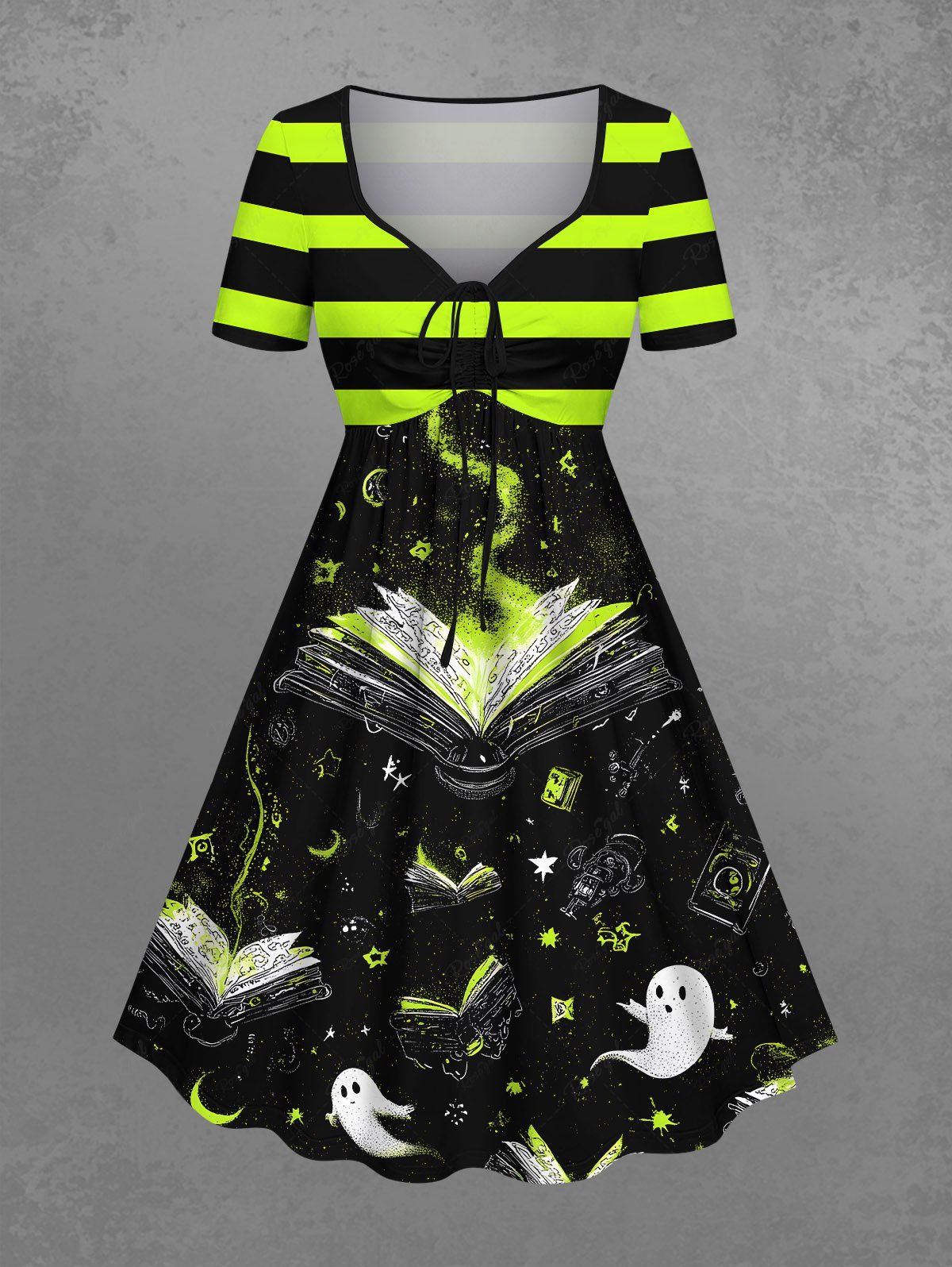 Gothic Plus Size Striped Ghost Moon Book Print Halloween Cinched A Line Dress