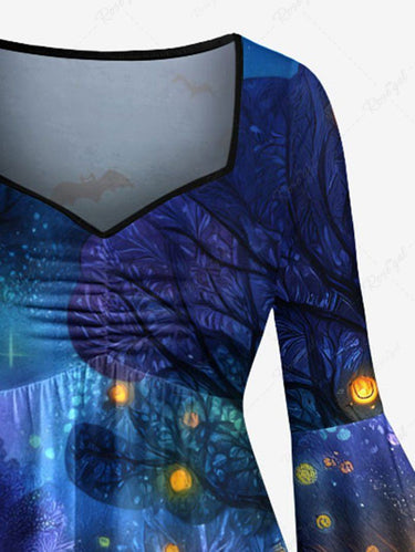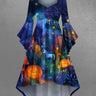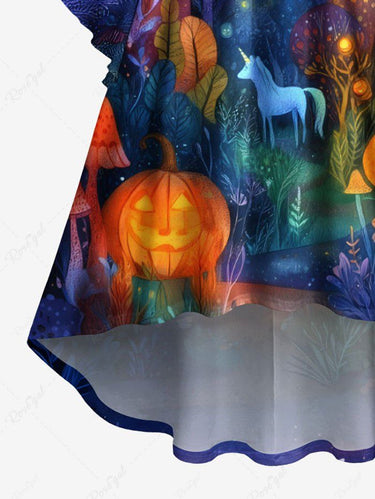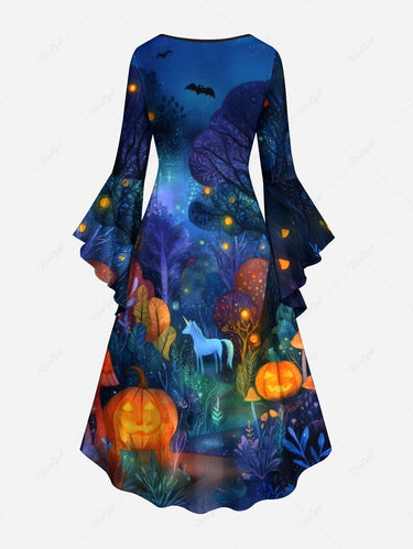 Gothic Plus Size Halloween Costume Pumpkin Lantern Bat Leaf Unicorn Print Ruched Flare Sleeves High Low Dress