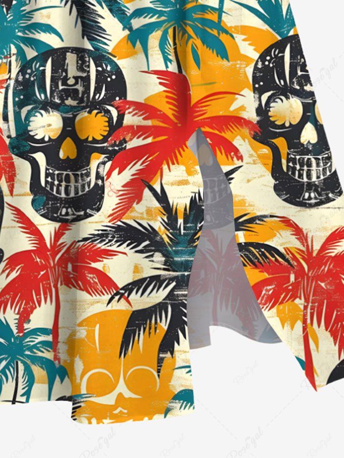 Gothic Plus Size Skull Coconut Tree Print Hawaii Split Pocket A Line Midi Dress