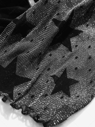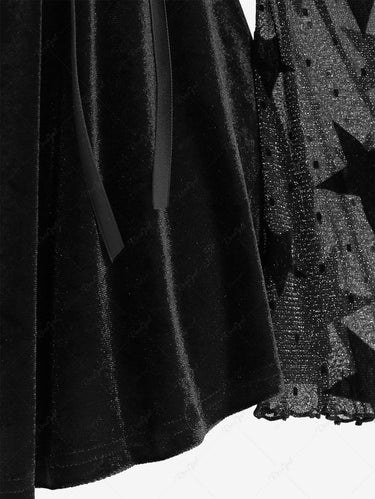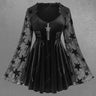 Gothic Plus Size Half Zipper Lace Up Ruched Pentagram Print Glitter Flutter Sleeves Velvet Halloween Top