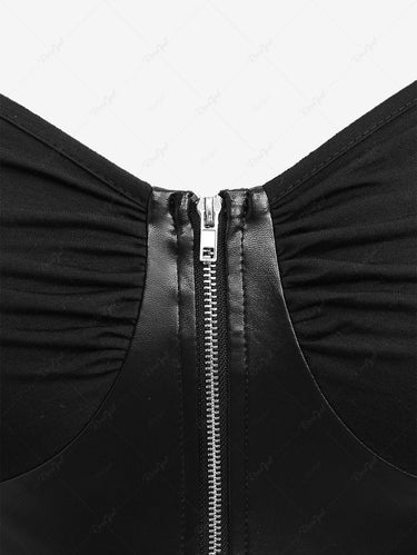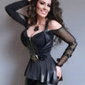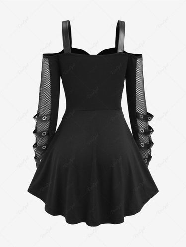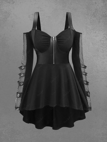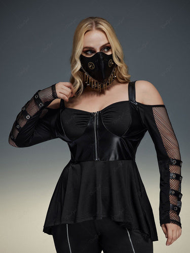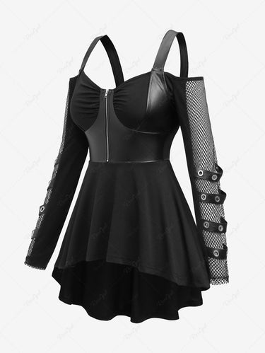 Gothic Plus Size PU Panel Ruched Zipper Fishnet Off The Shoulder High Low Top