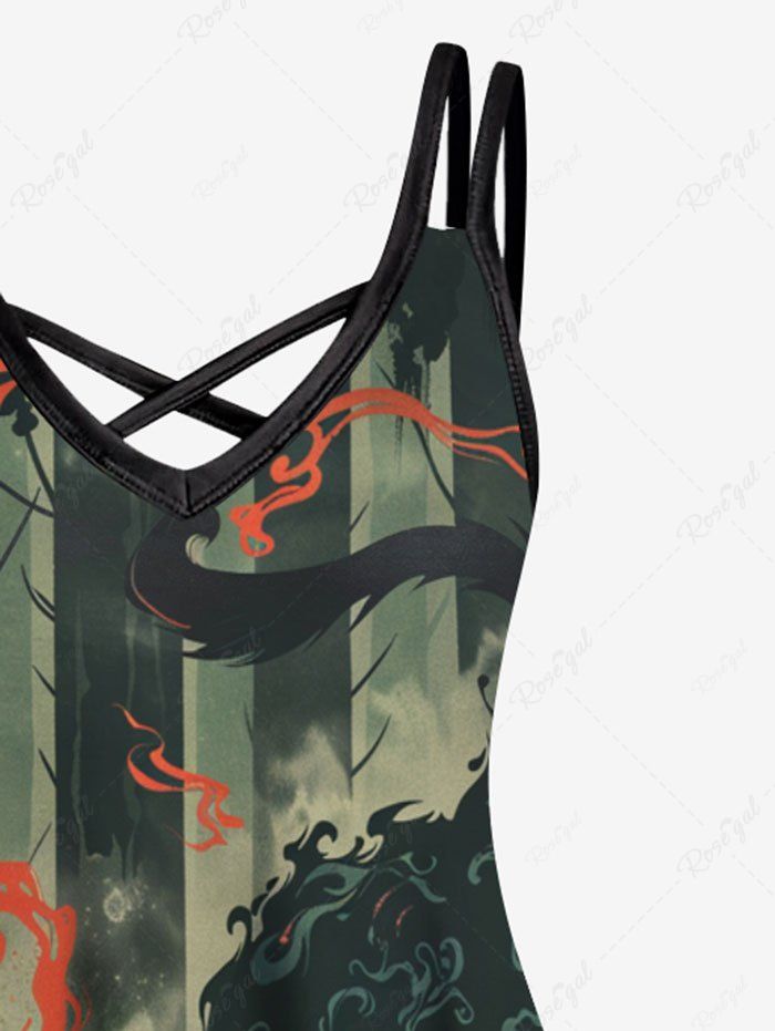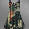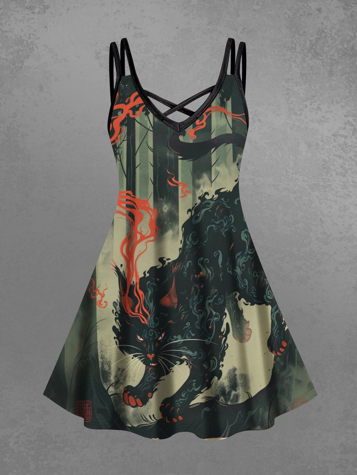 Gothic Plus Size Devil Cat Forest Print Crisscross Strappy A Line Cami Dress