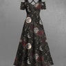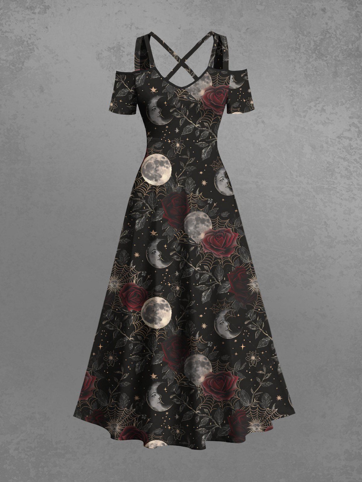 Gothic Plus Size Moon Spider Web Rose Flower Print Cold Shoulder Crisscross A Line Maxi Dress