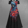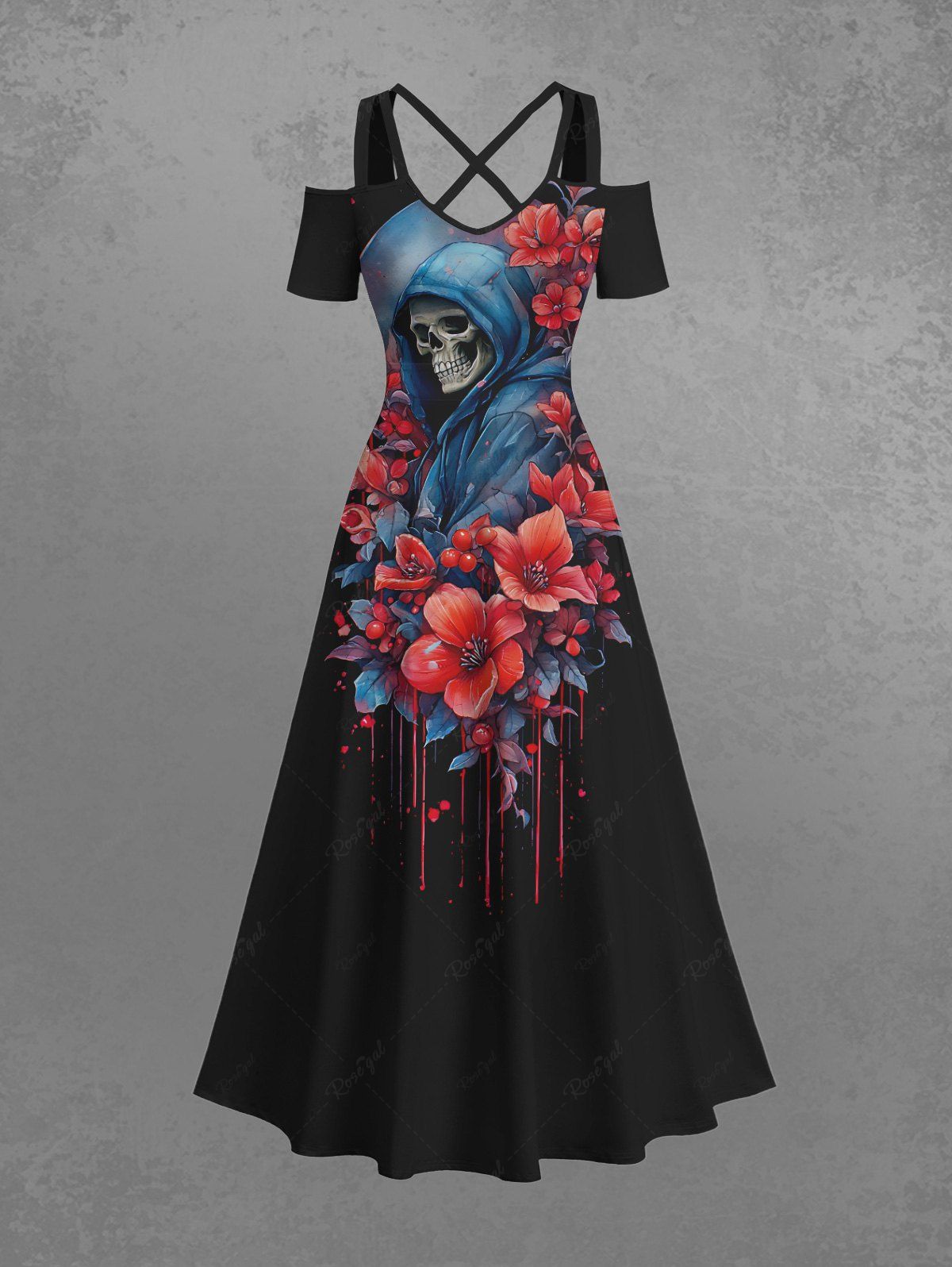 Gothic Plus Size Skull Flower Print Cold Shoulder Crisscross A Line Maxi Dress