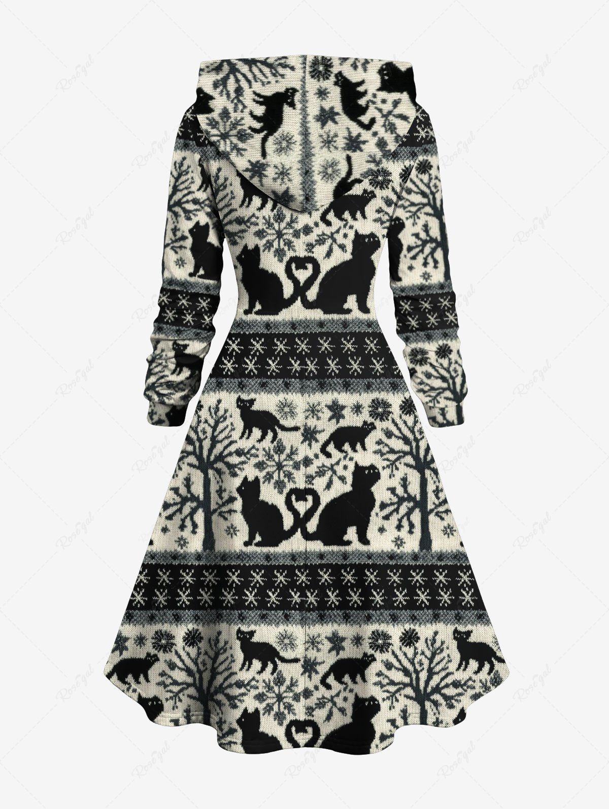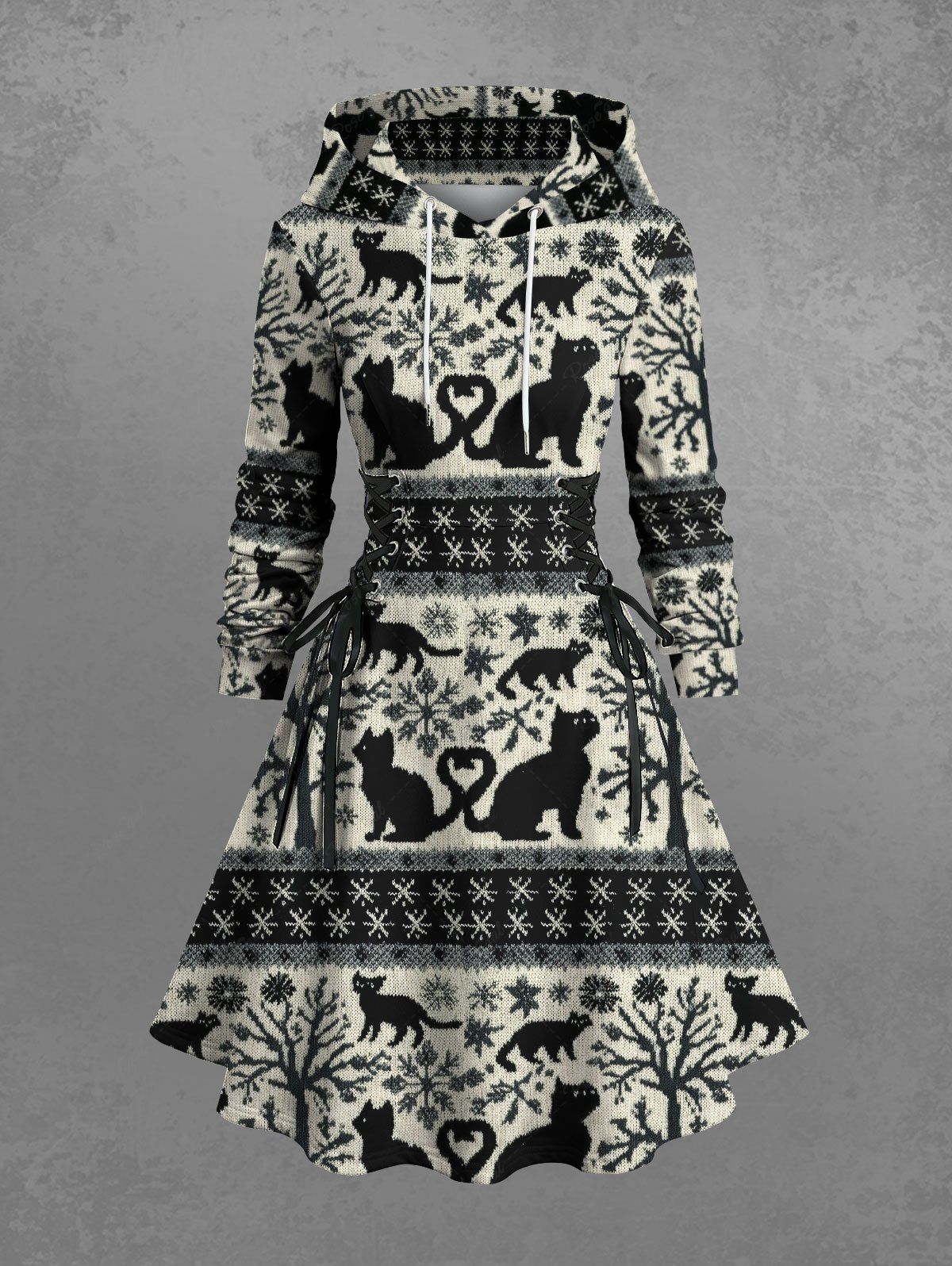 Gothic Plus Size Tree Snowflake Cat Print Lace Up A Line Hooded Dress