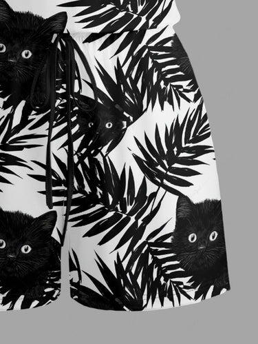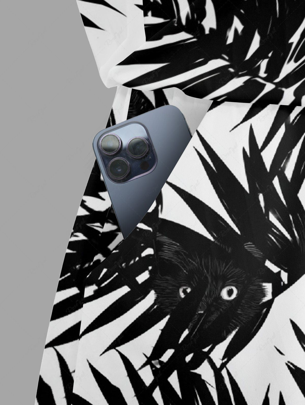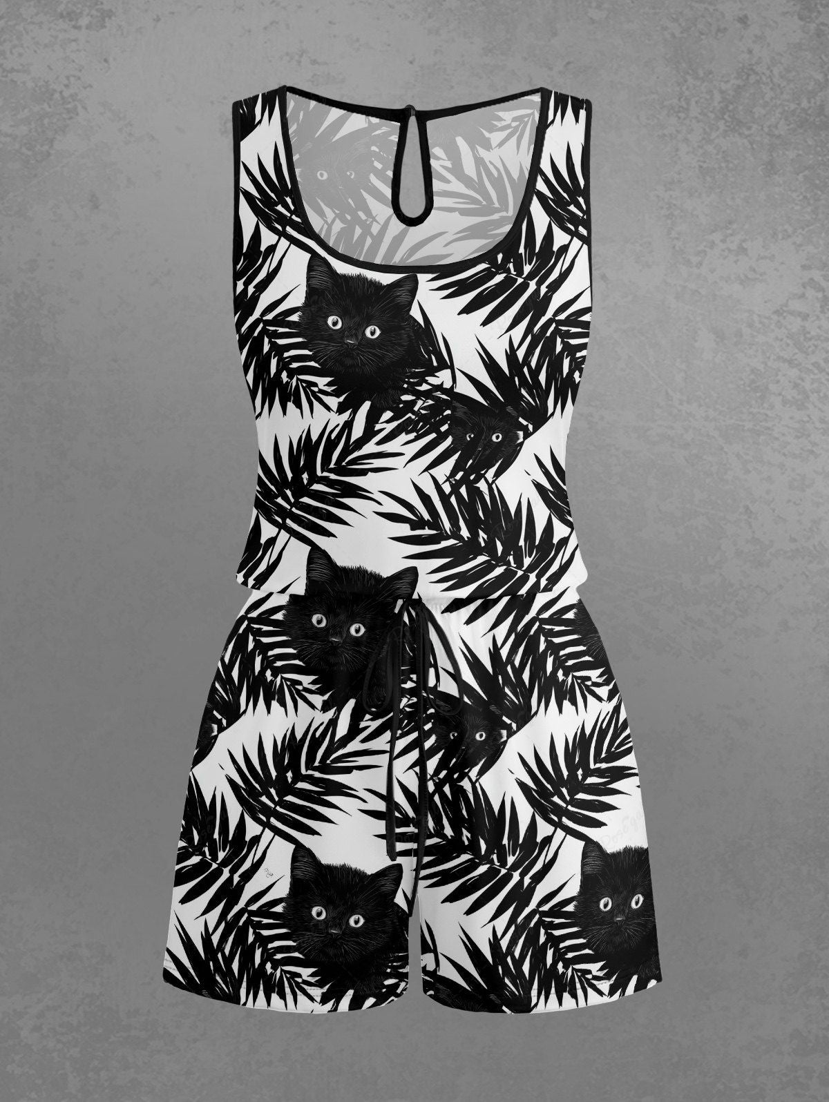 Gothic Plus Size Tropical Leaf Cat Print Drawstring Pocket Romper