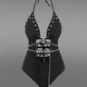 Gothic Plus Size O-Ring Chain Strappy Grommet Ruched Hollow Out Solid Backless Halter Swimsuit
