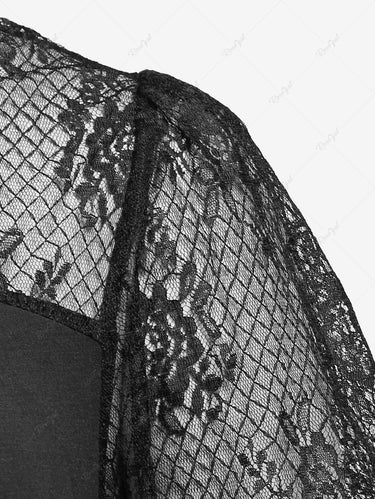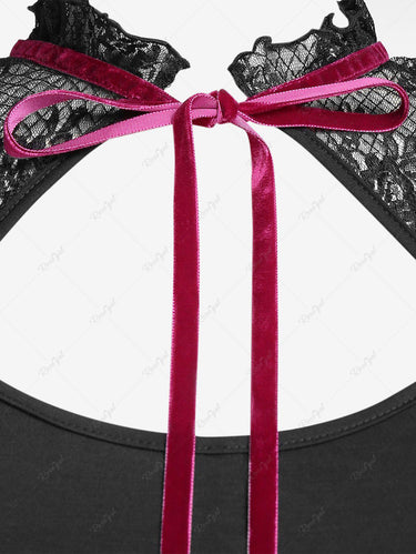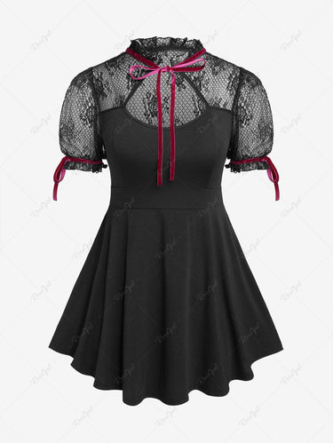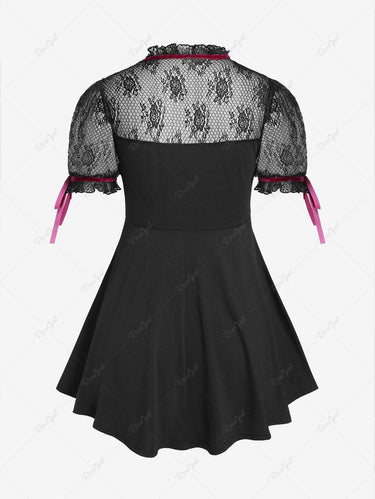 Victorian Gothic Plus Size Lace Panel Cutout Contrast Ribbons Top