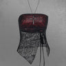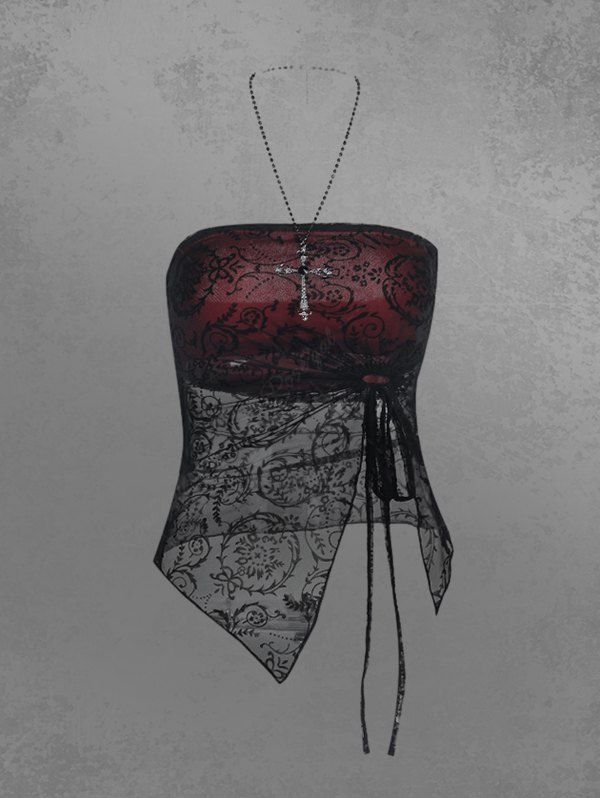 Gothic Dark Style Floral Mesh Flocking Cinched Split Asymmetric Bandeau Top with Beading Cross Necklace