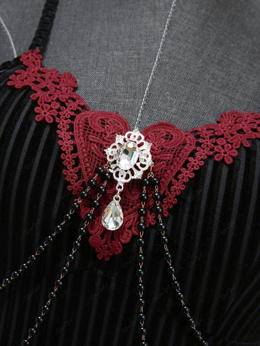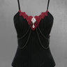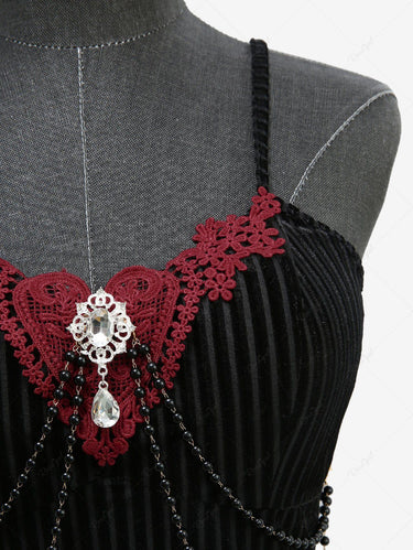 Gothic Layered Beading Chain Applique Rhinestone Decor Striped Flocking Backless Cami Top