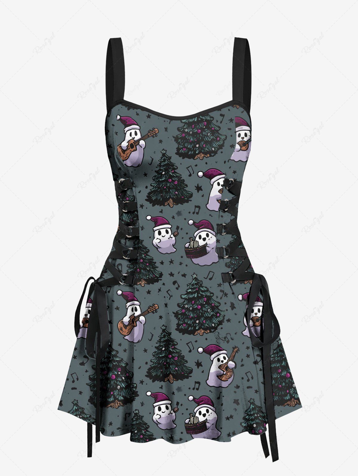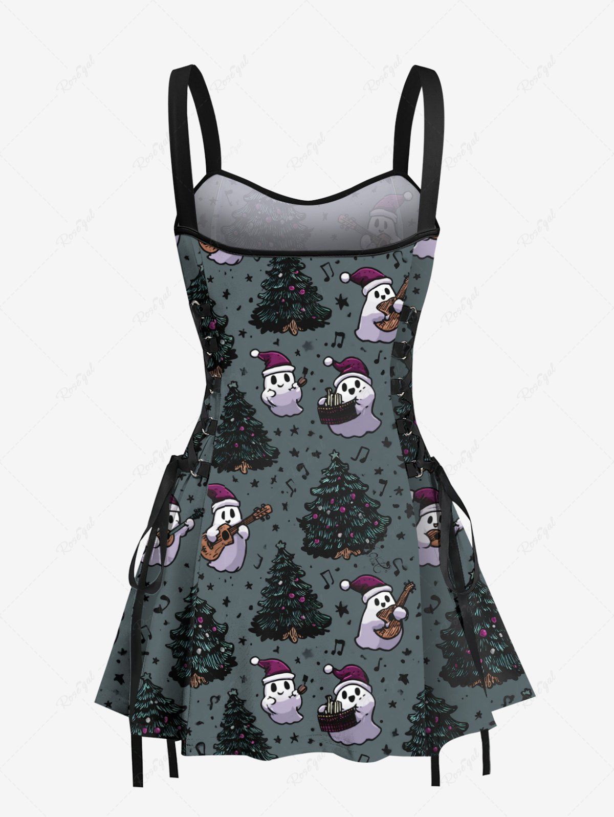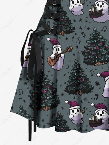 Gothic Christmas Tree Hat Ghost Guitar Print Lace Up Tank Dress
