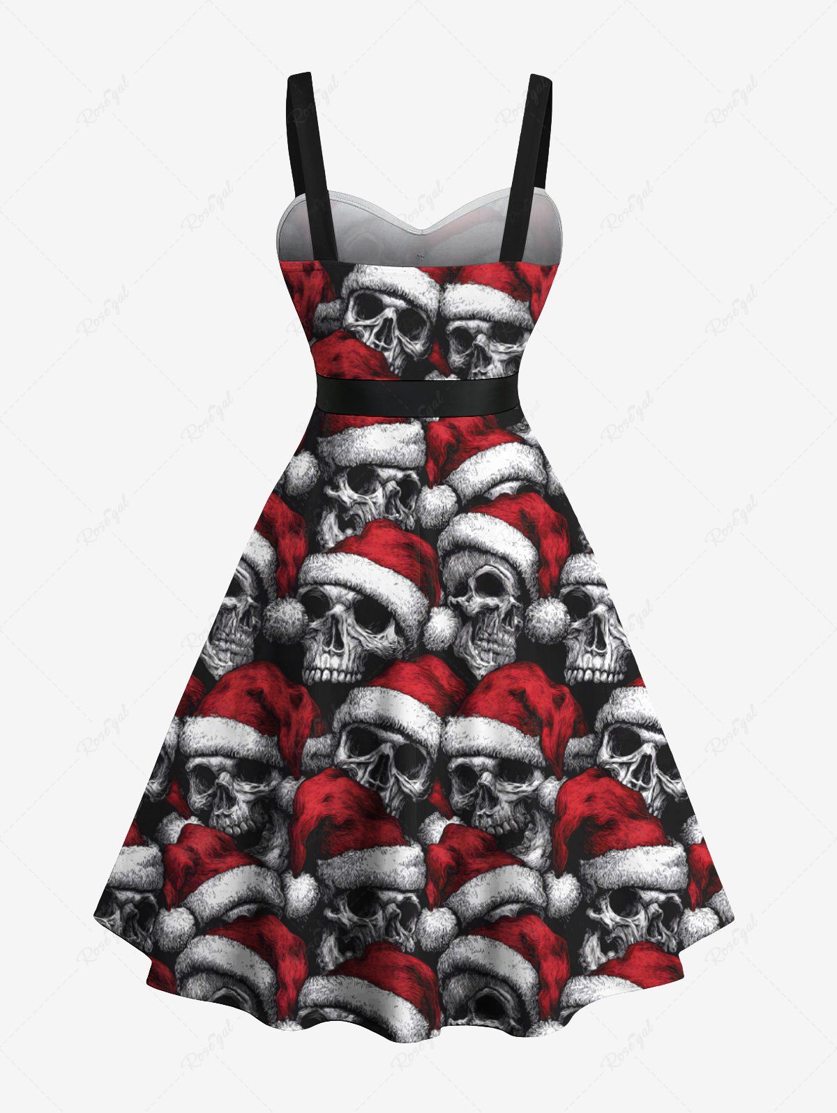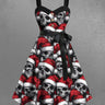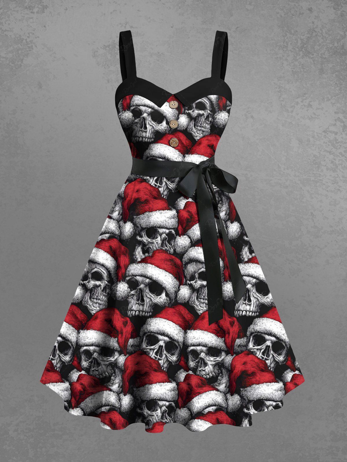 Gothic Plus Size Christmas Hat Skull Print Button A Line Dress with Removable Belt