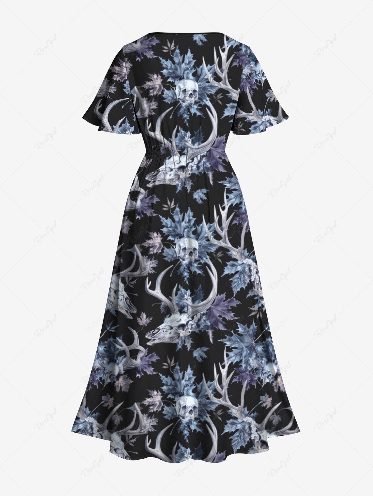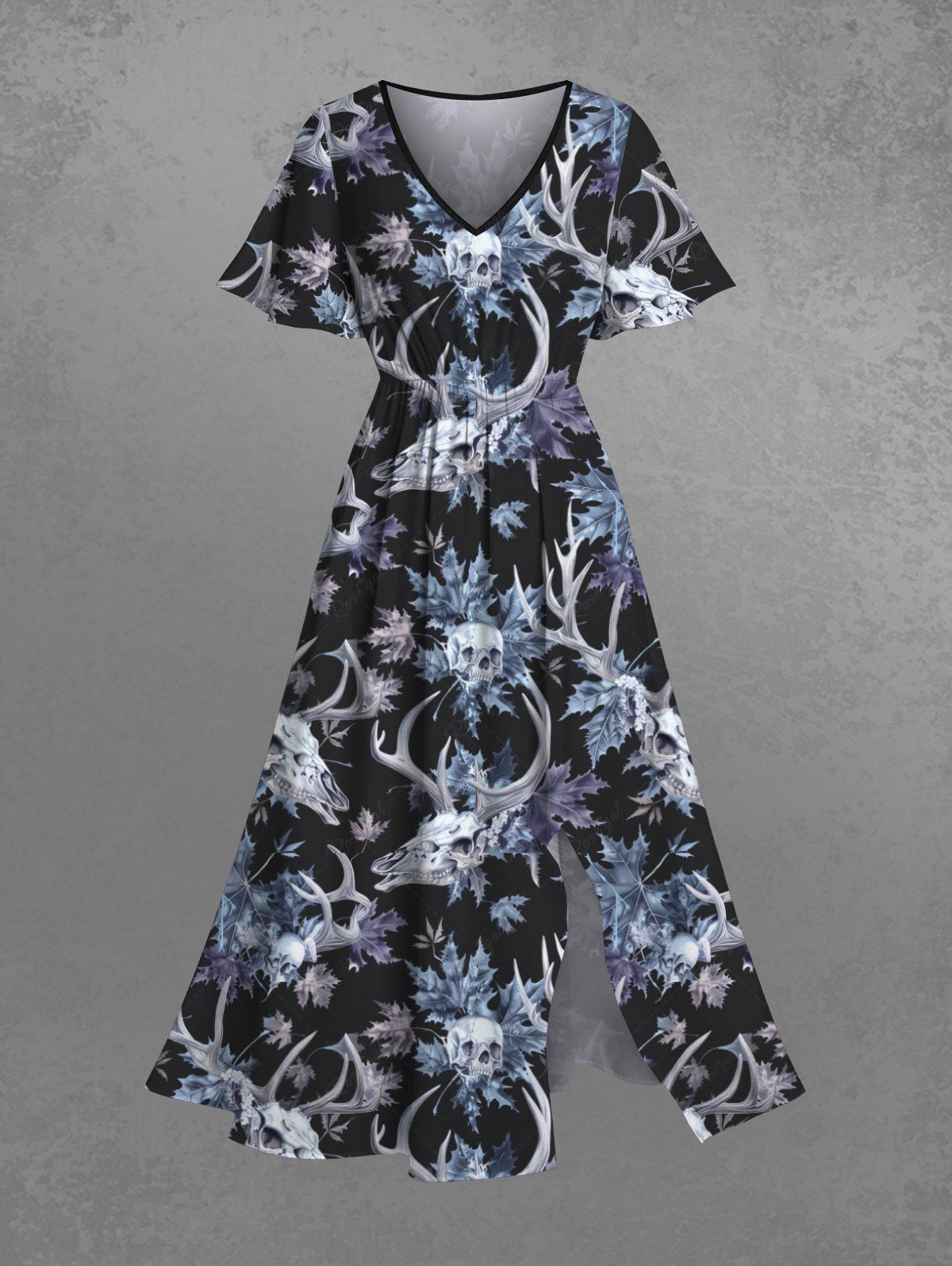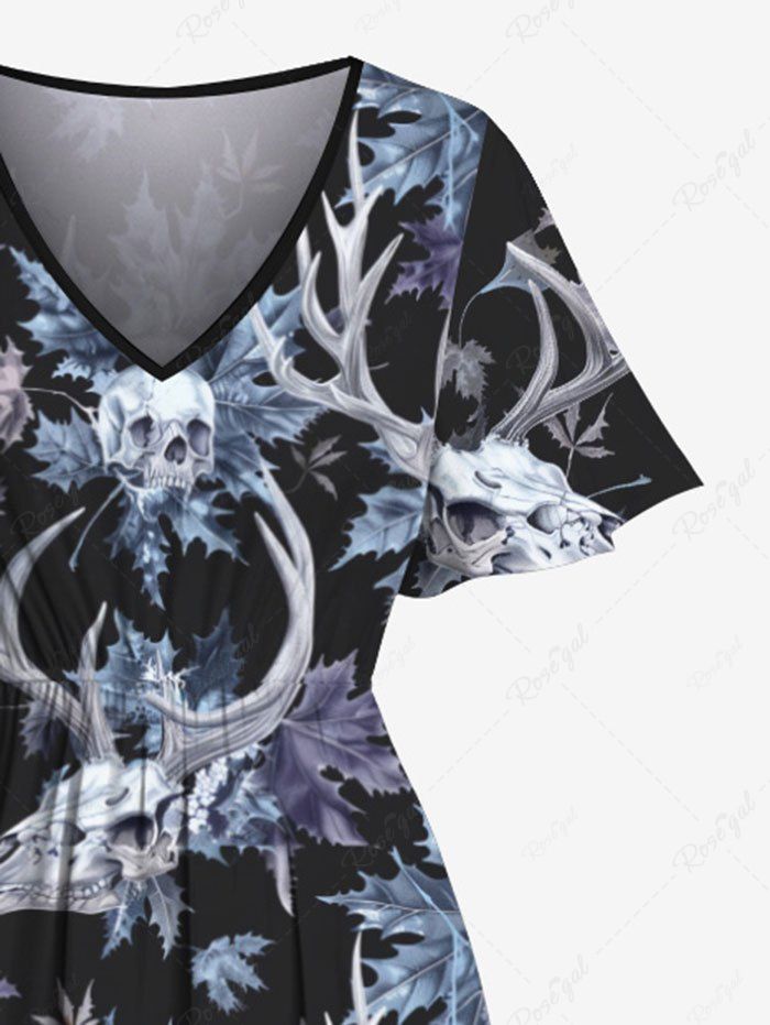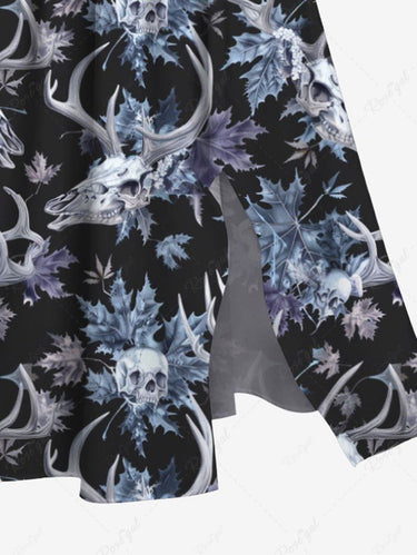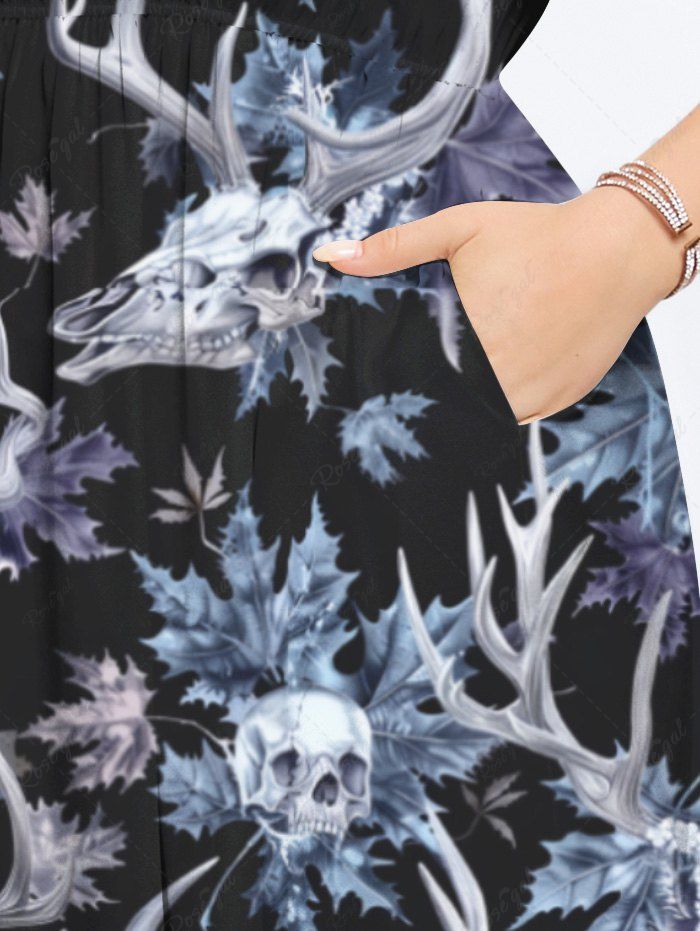 Gothic Plus Size Skull Christmas Elk Leaf Print Split Pocket A Line Midi Dress