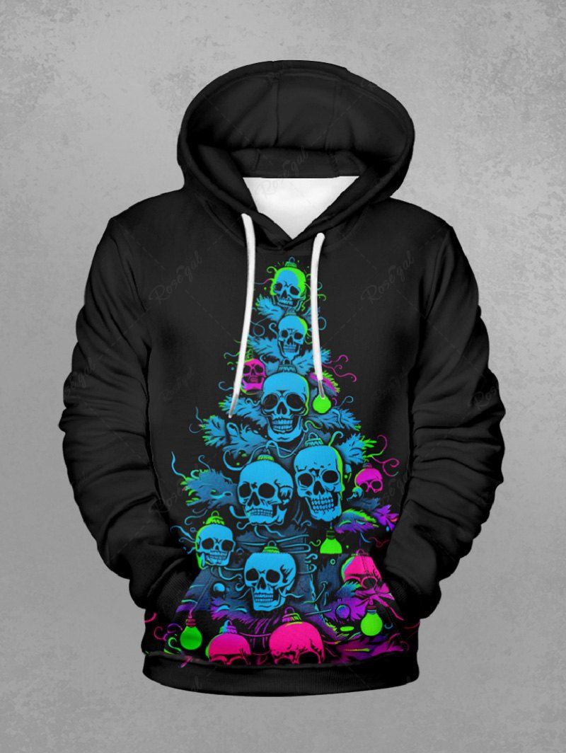 Gothic Plus Size Skull Christmas Tree Ball Print Pocket Drawstring Pullover Long Sleeves Hoodie For Men