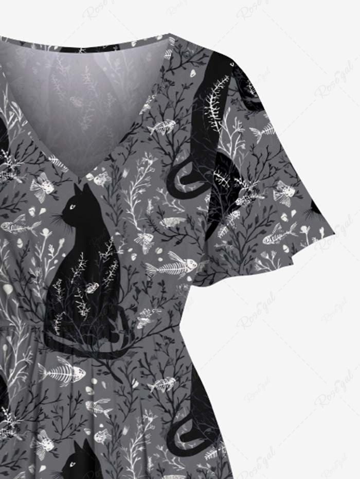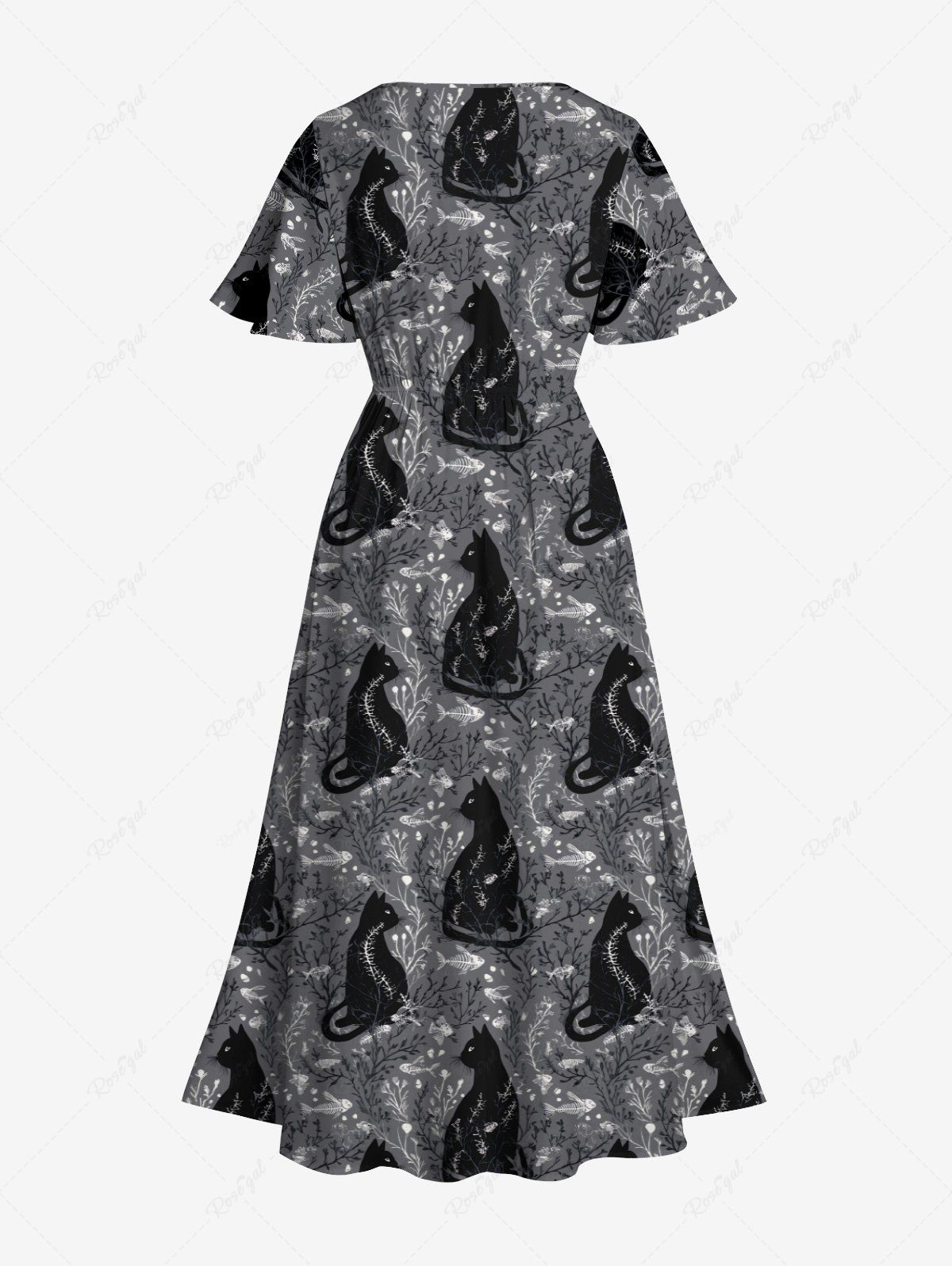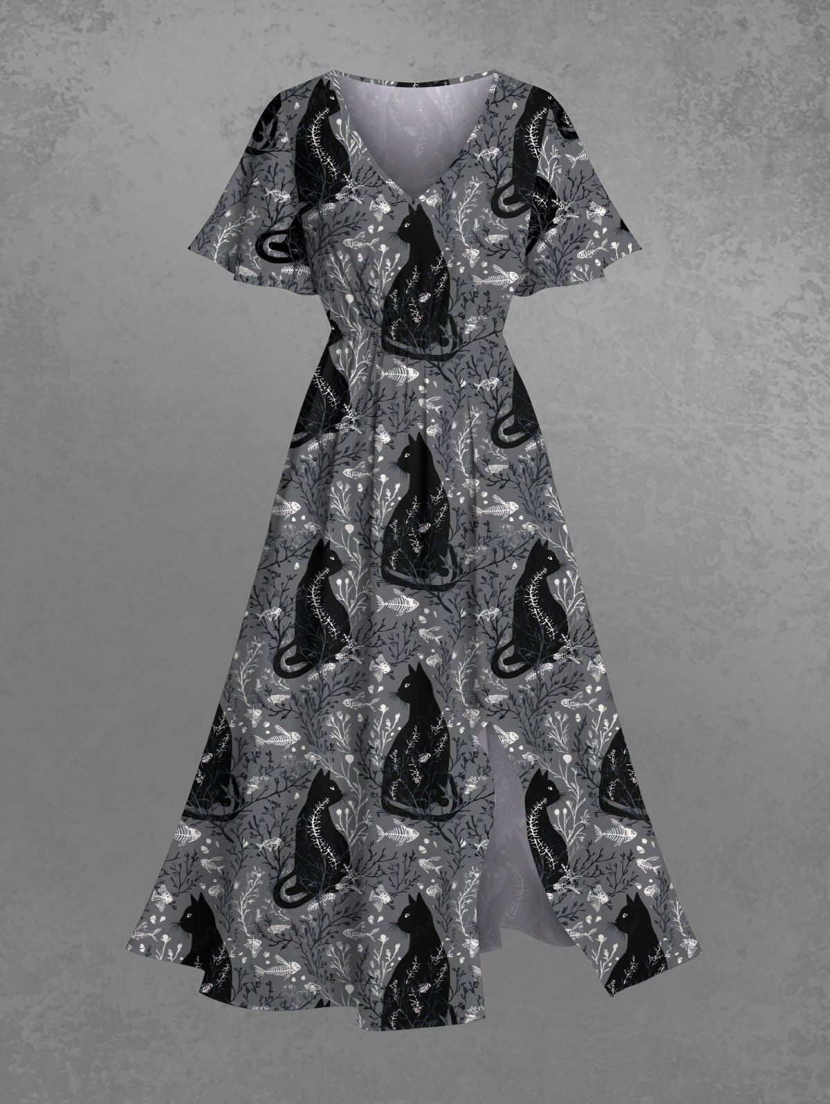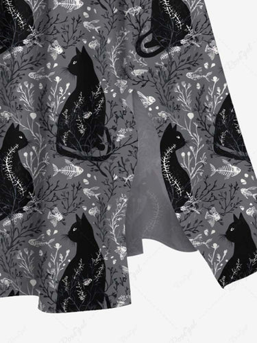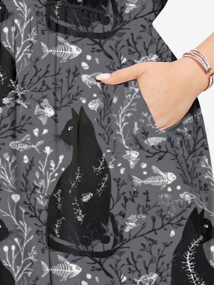Gothic Plus Size Cat Branch Print Split Pocket A Line Midi Dress