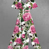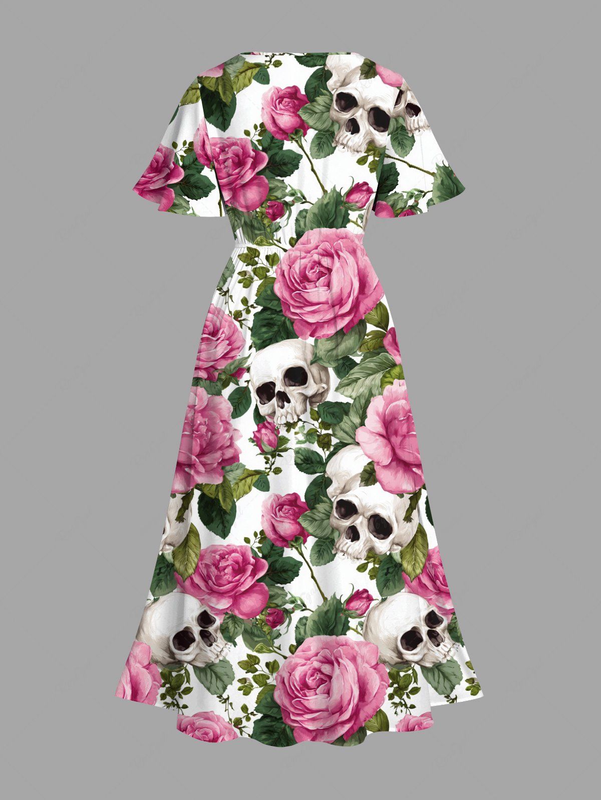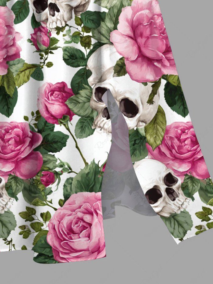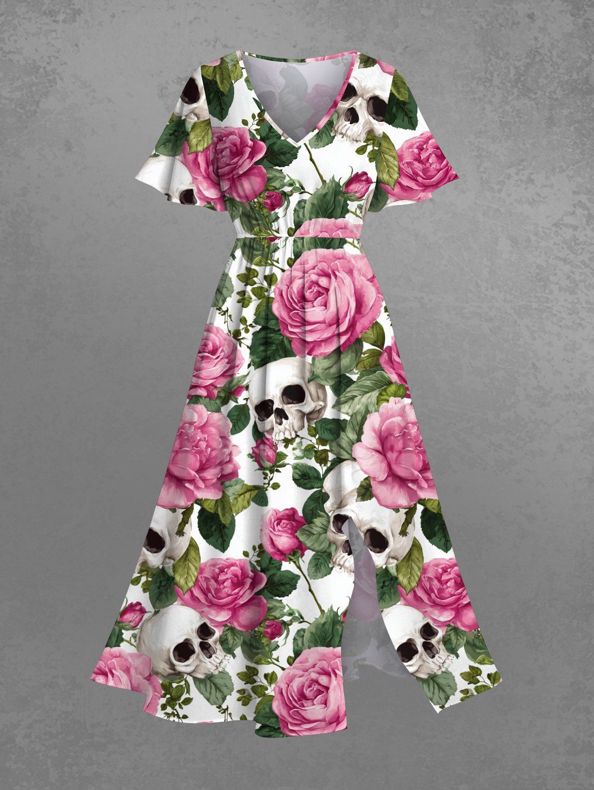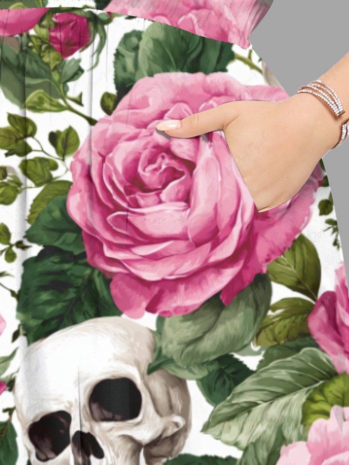 Gothic Plus Size Skull Flower Leaf Print Split Pocket A Line Midi Dress