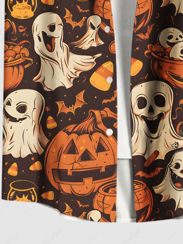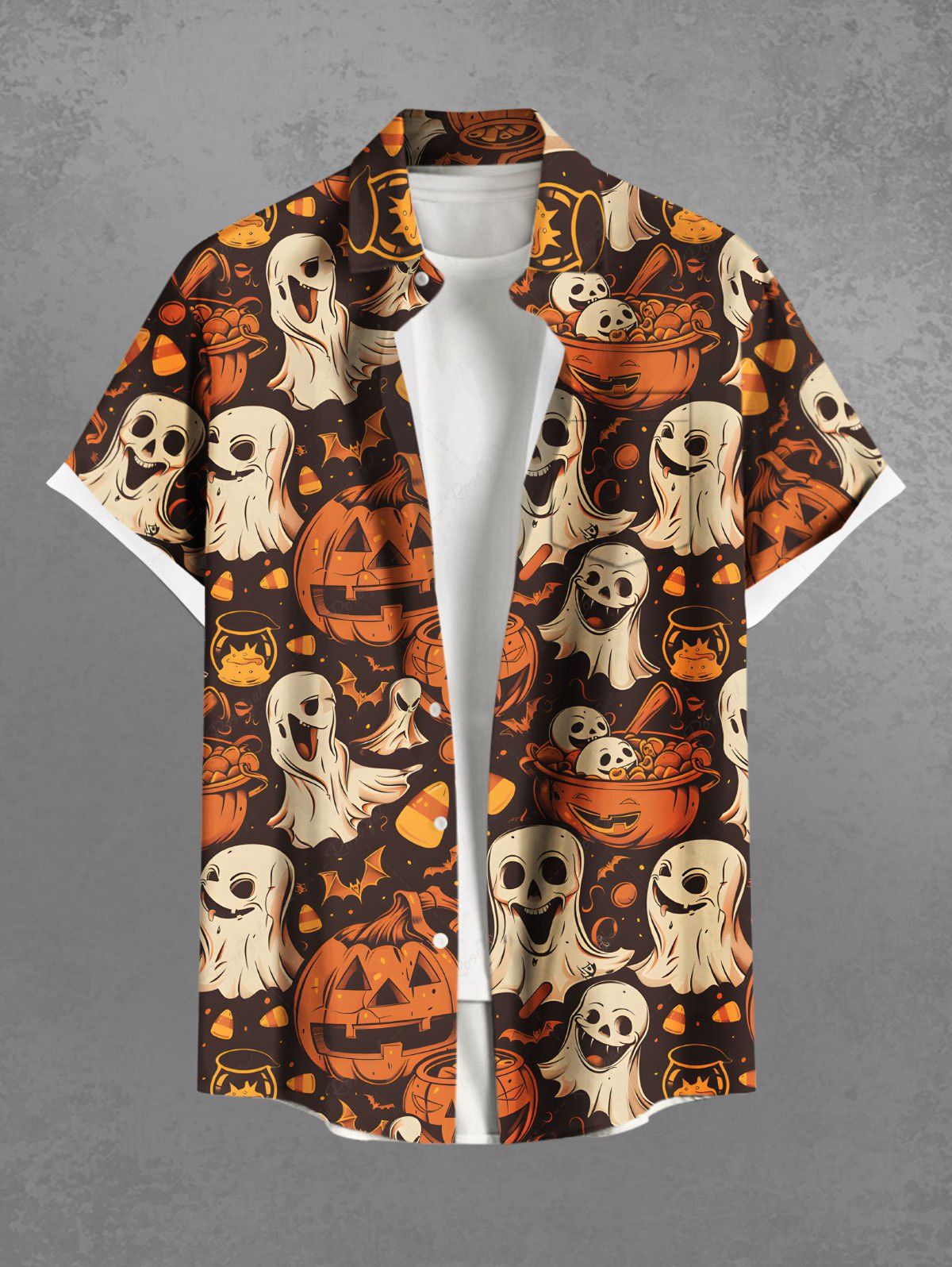 Gothic Plus Size Pumpkin Ghost Bat Print Halloween Button Pocket Shirt For Men