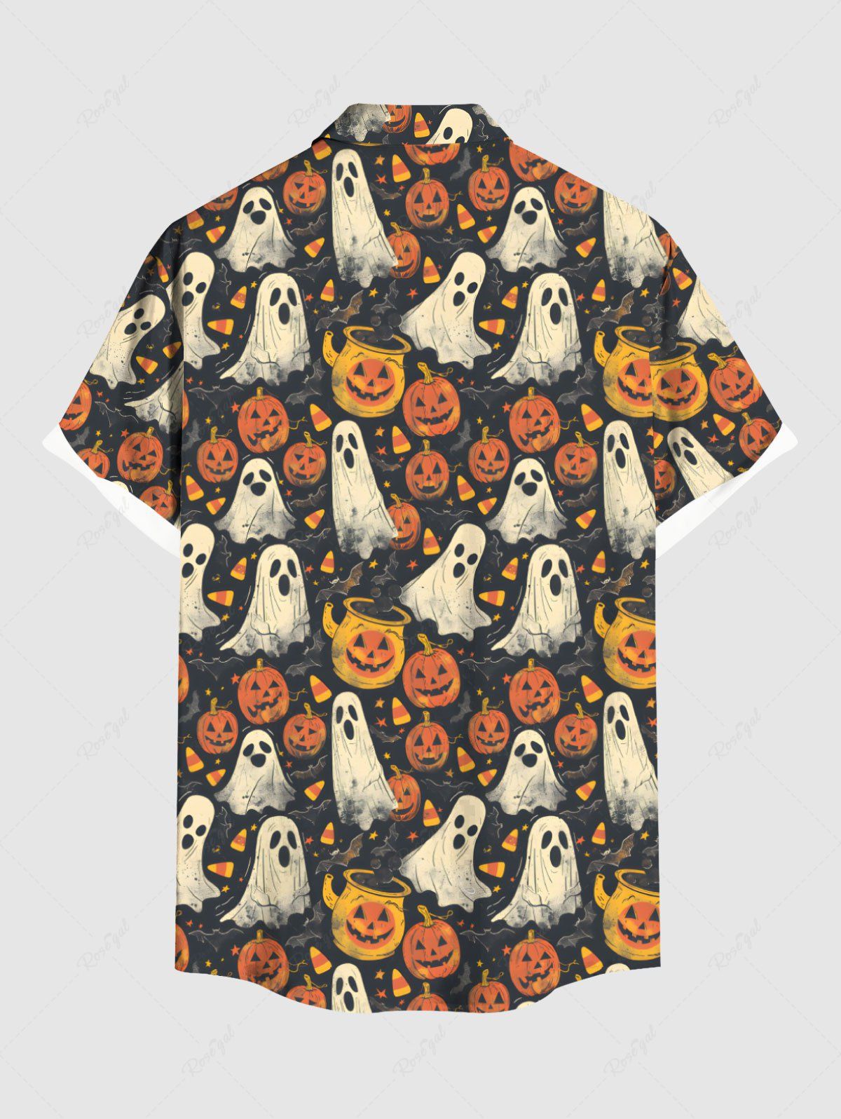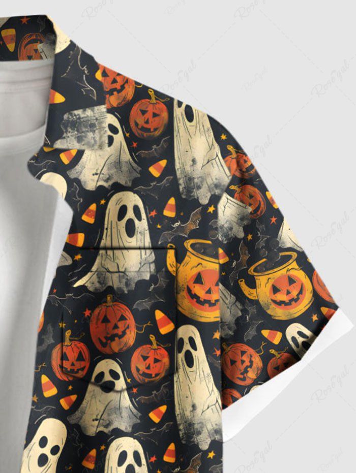 Gothic Plus Size Pumpkin Ghost Bat Print Halloween Button Pocket Shirt For Men