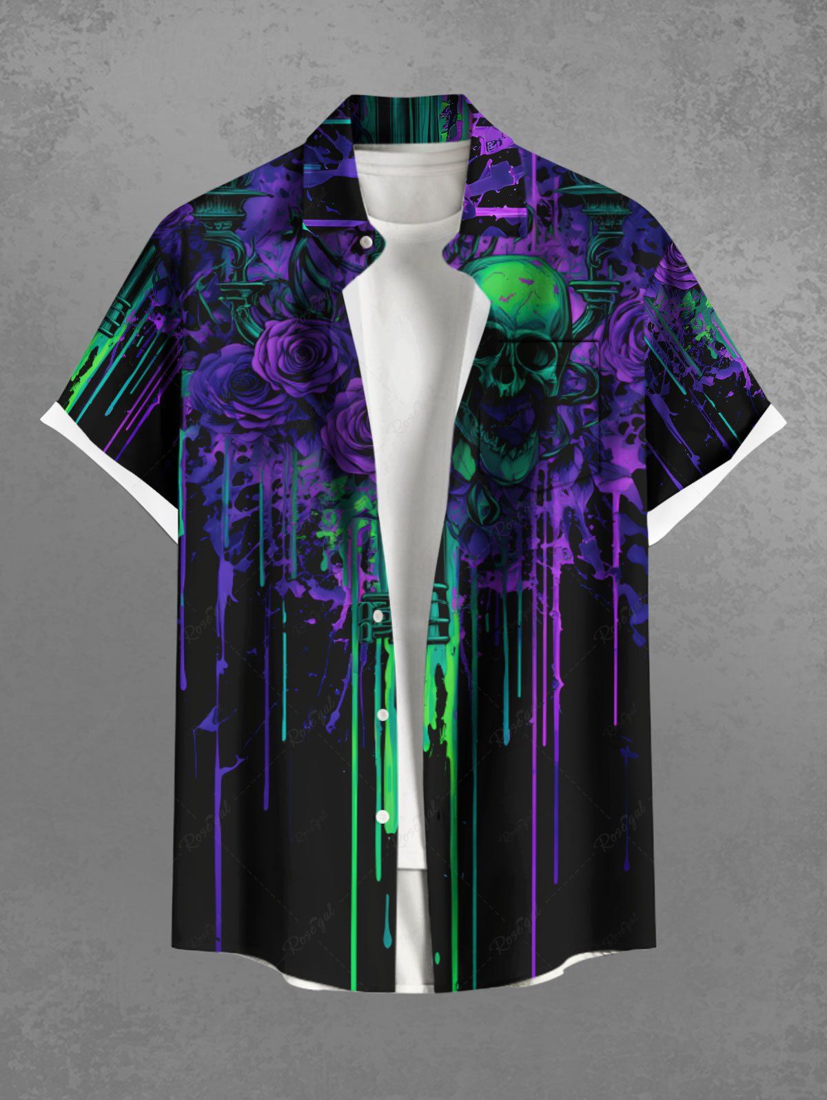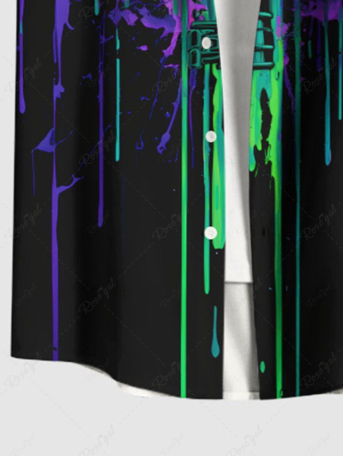 Gothic Plus Size Skulls Rose Flowers Paint Drops Print Buttons Pocket Shirt For Men