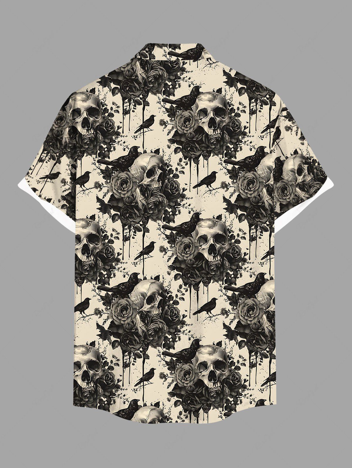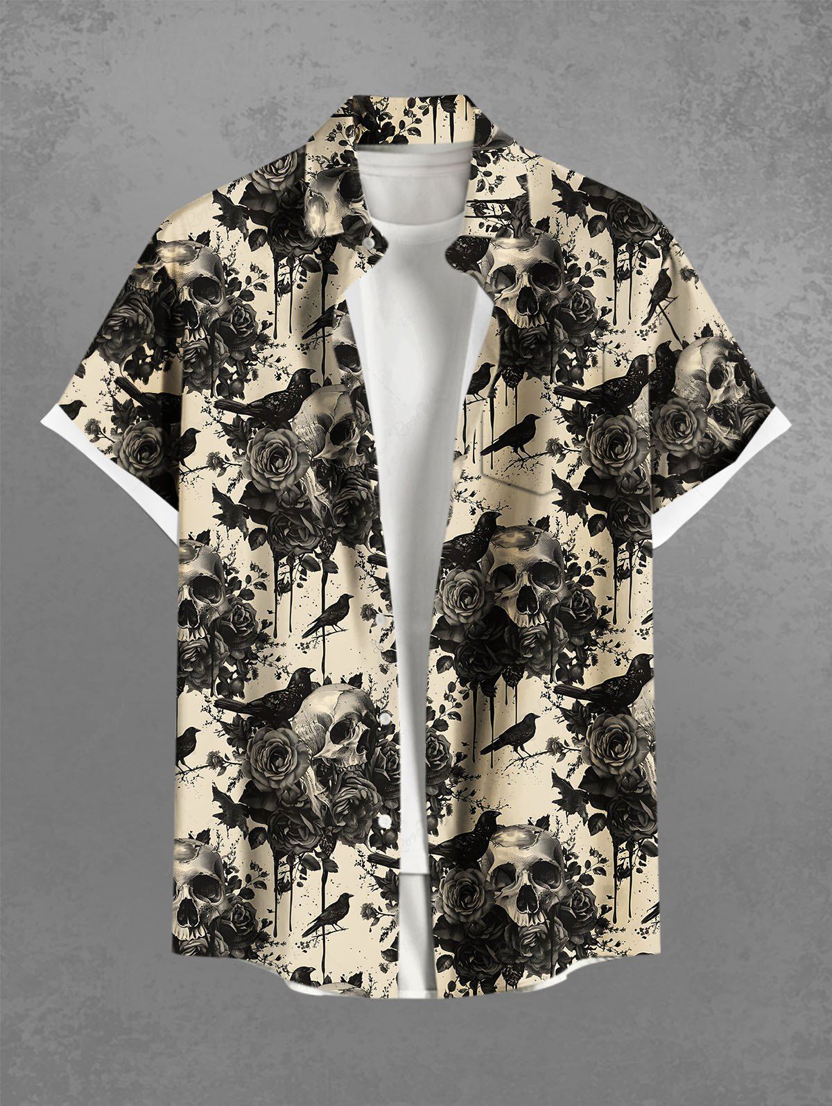 Gothic Plus Size Halloween Crow Skulls Rose Flowers Print Buttons Pocket Shirt For Men