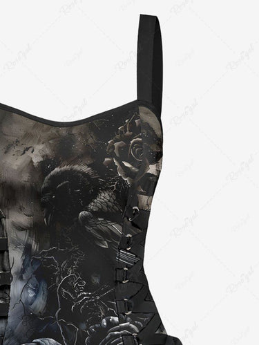 Gothic Ink Painting Tie Dye Eagle Tree Branch Rose Flower Print Halloween Costume Lace Up A Line Tank Dress