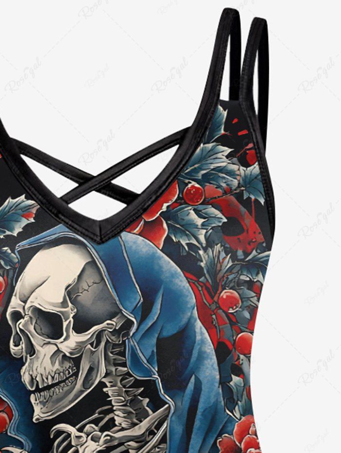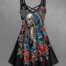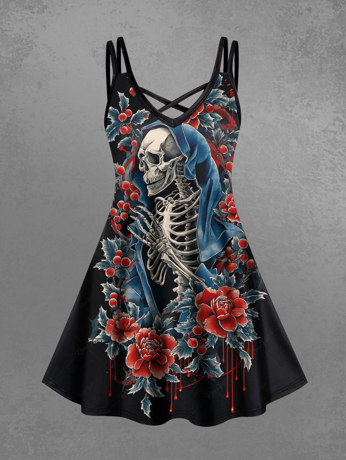 Gothic Plus Size Christmas Leaf Holly Flower Skeleton Print Crisscross Strappy A Line Cami Dress
