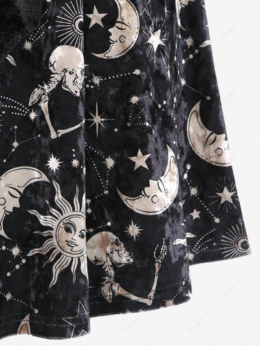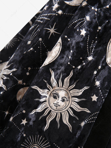 Gothic Plus Size Sun Moon Star Printed Full Buttons Turn-down Collar Tied A Line Shirted Velvet Dress
