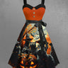 Gothic Plus Size Halloween Pumpkin Cat Bat Tree Print Buttons Turn Down Collar Dress With Belt