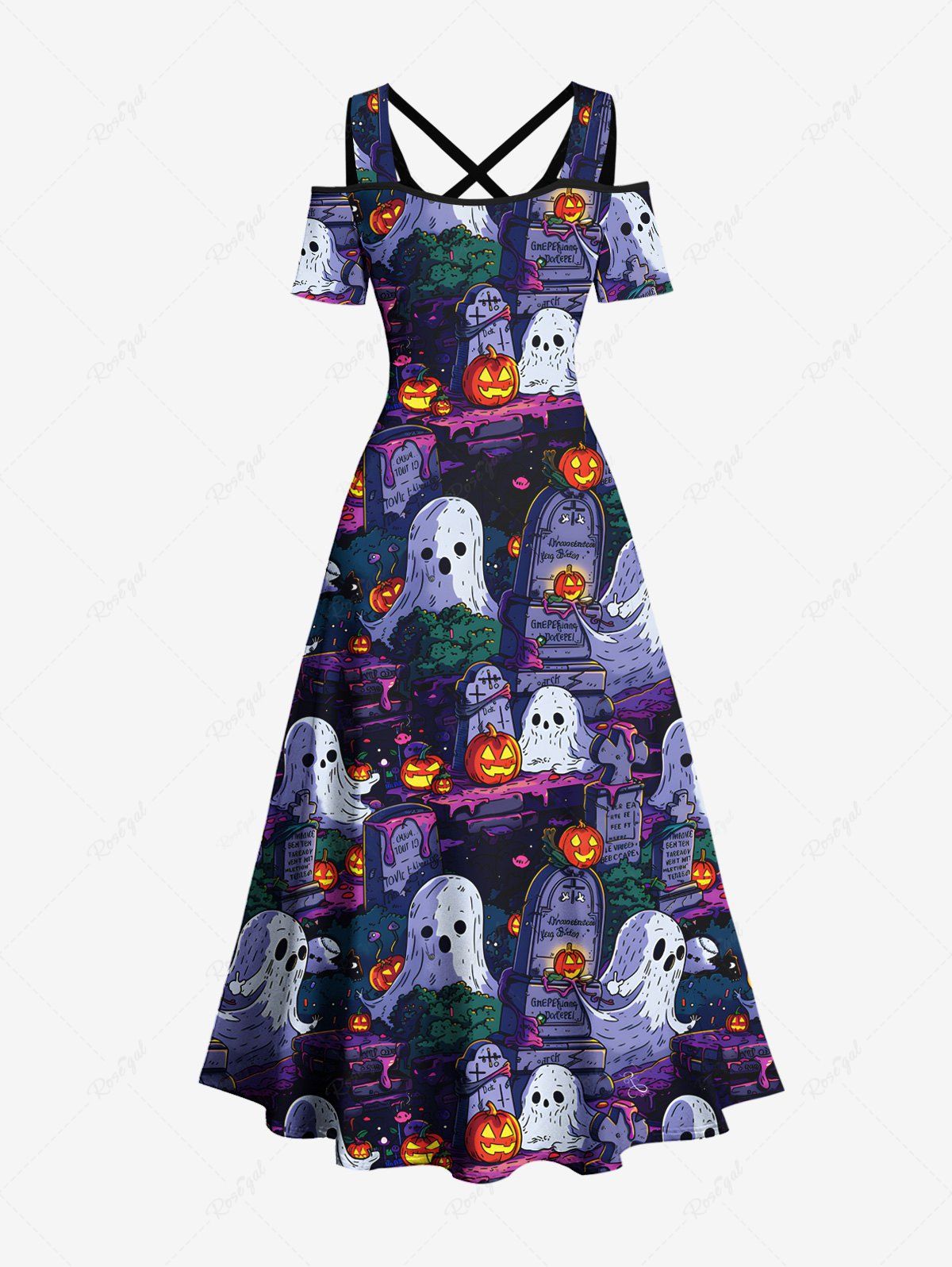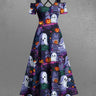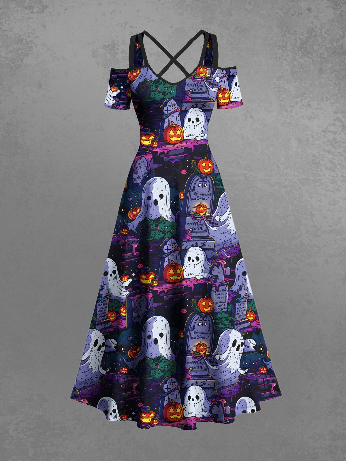 Gothic Plus Size Halloween Pumpkin Ghost Tombstone Print Shoulder Crisscross Maxi Dress