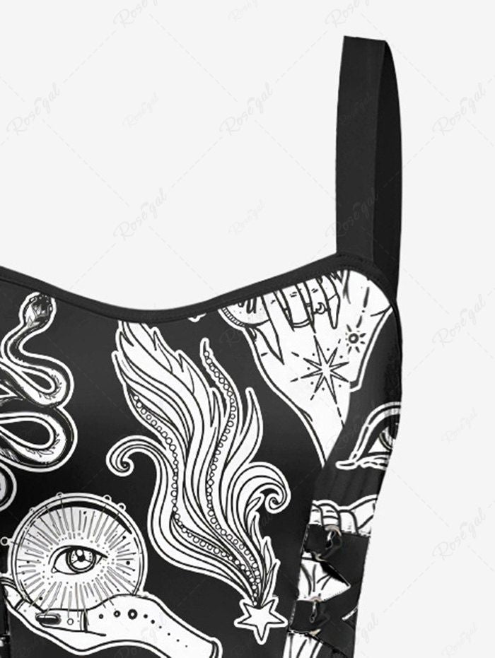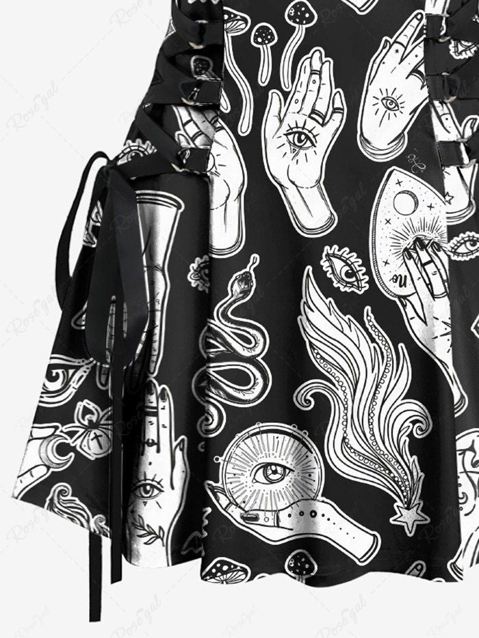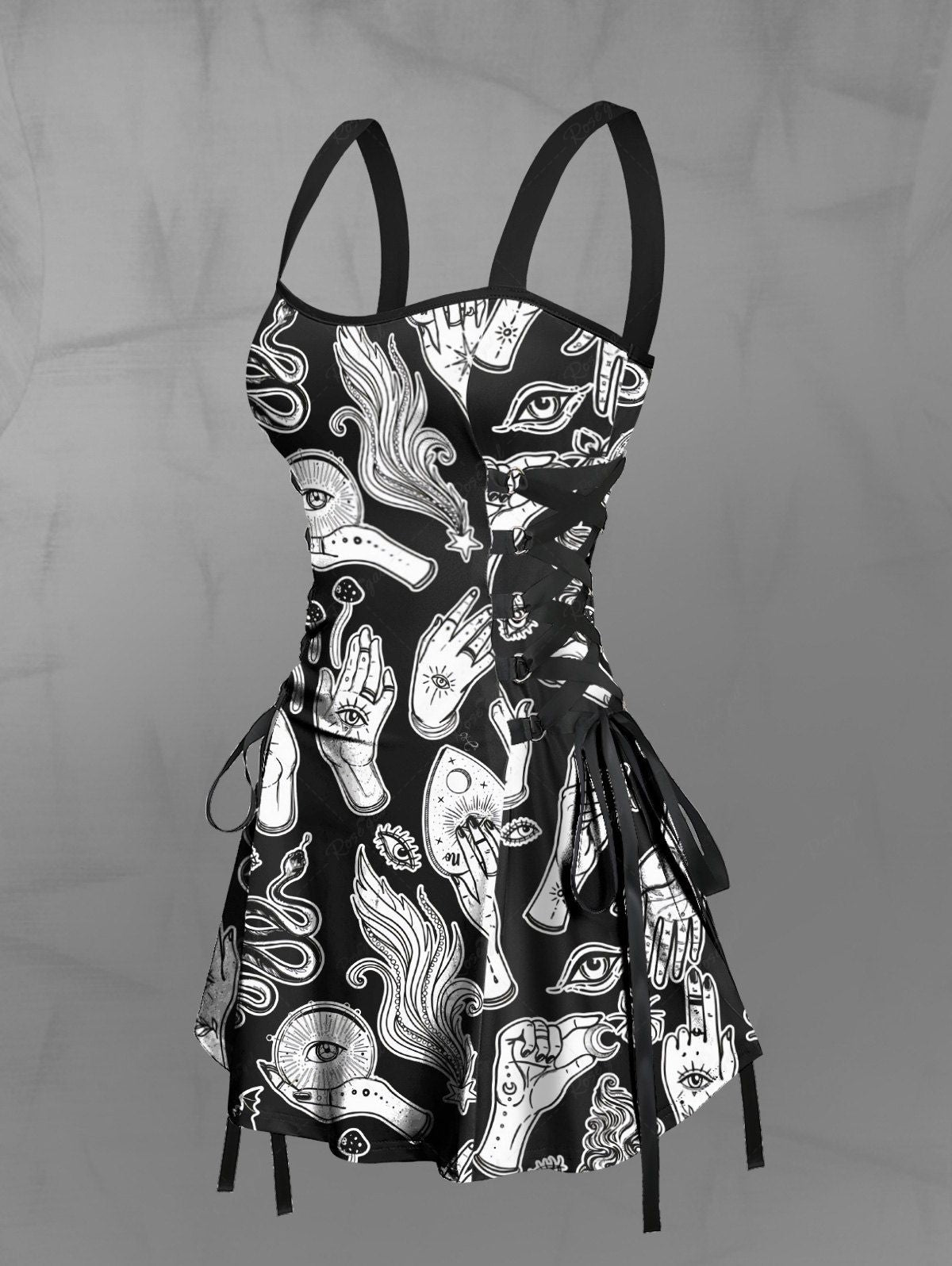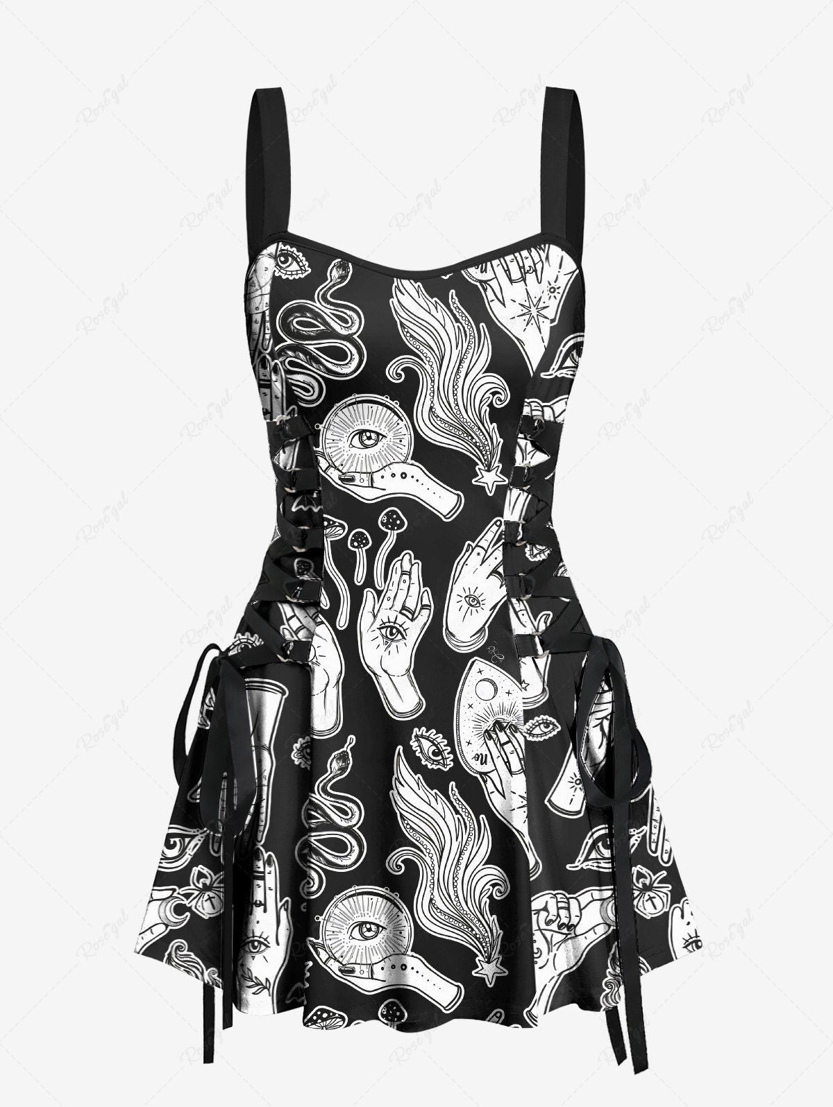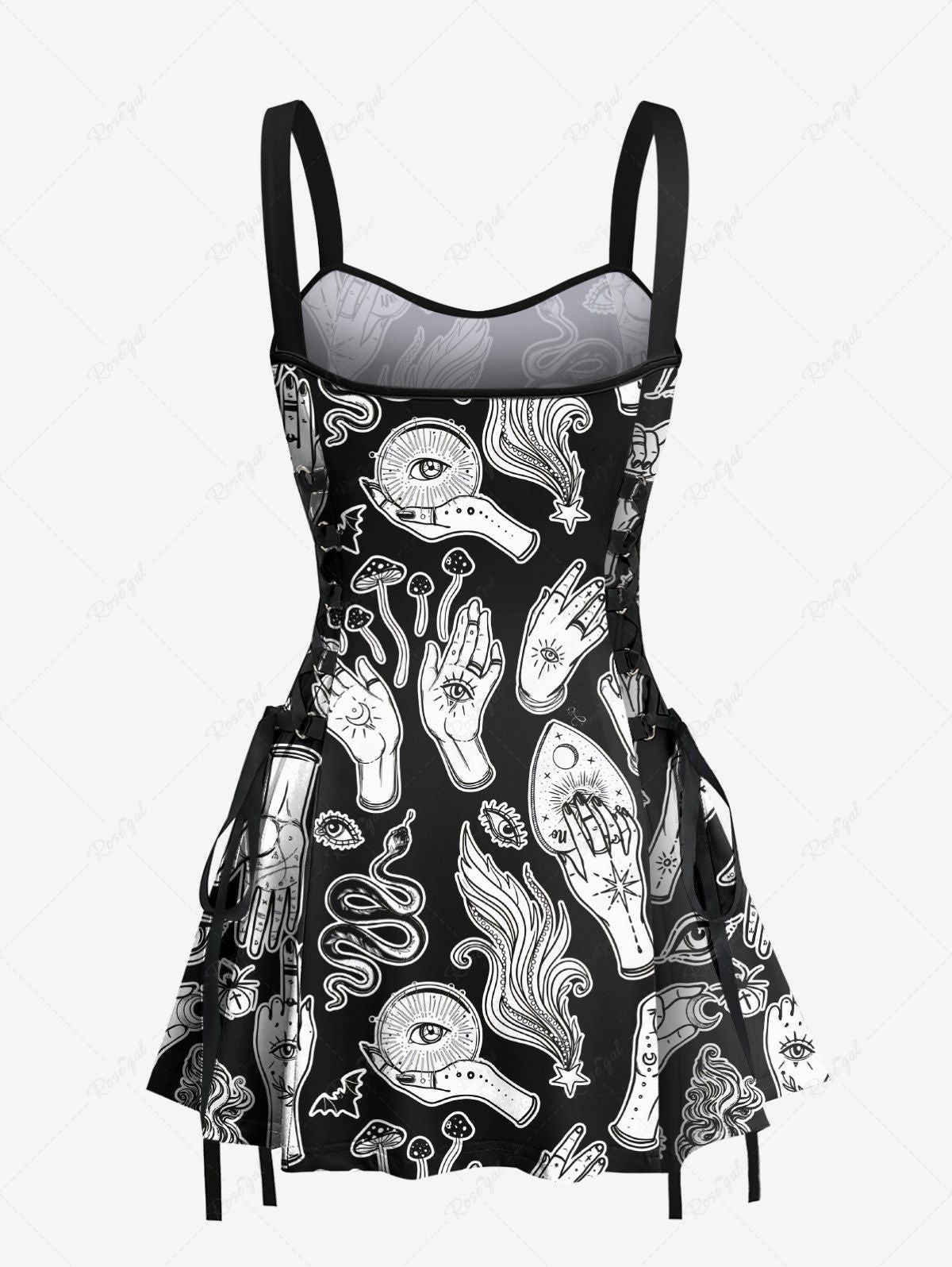 Gothic Eye Hand Mushroom Bat Snake Print Lace Up A Line Tank Dress