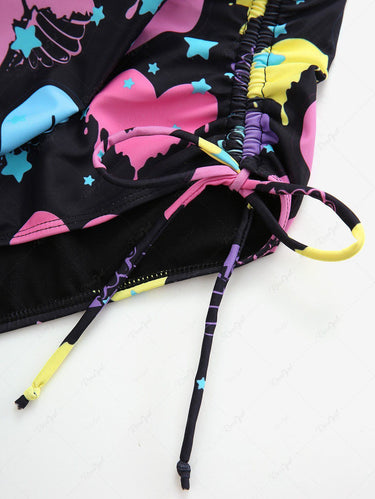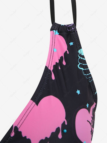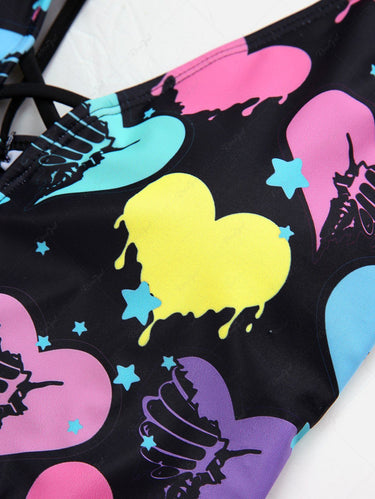 Gothic Plus Size Bloody Skeleton Heart Stars Printed Cinched Crisscross Strappy Backless Hollow Out Halter Swimsuit