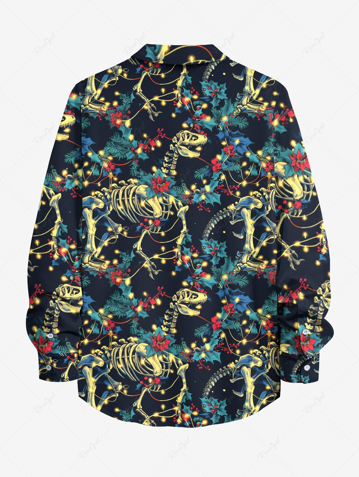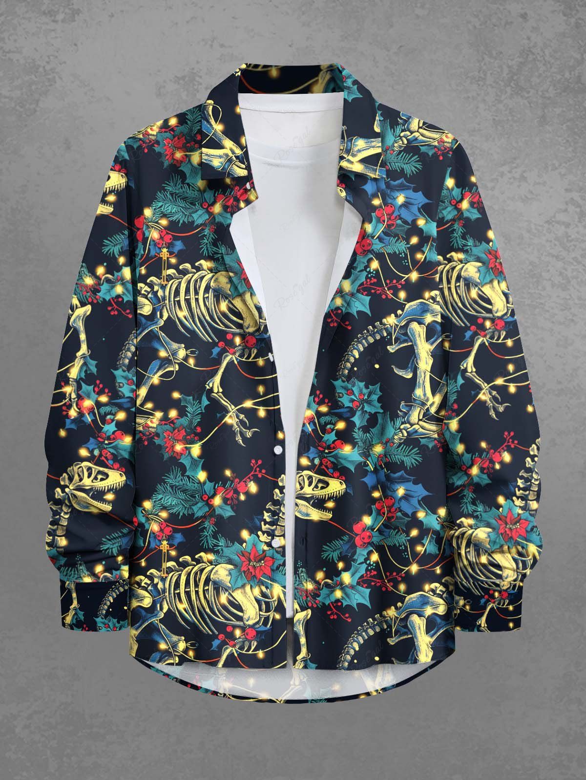 Gothic Plus Size Christmas Holly Leaf Light Skeleton Dinosaur Print Long Sleeves Shirt For Men