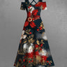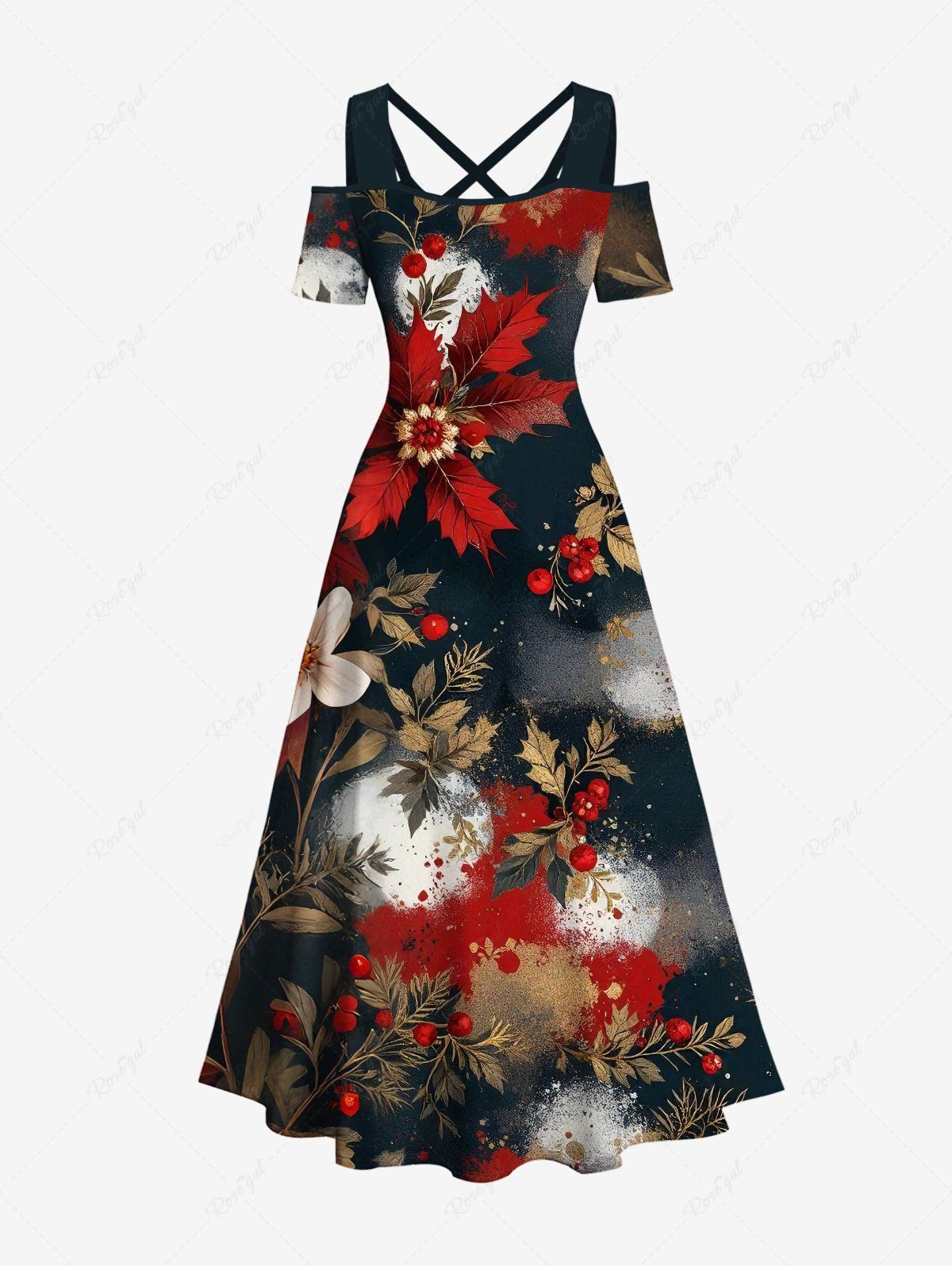Gothic Plus Size Christmas Holly Leaf Painting Print Cold Shoulder Crisscross A Line Maxi Dress