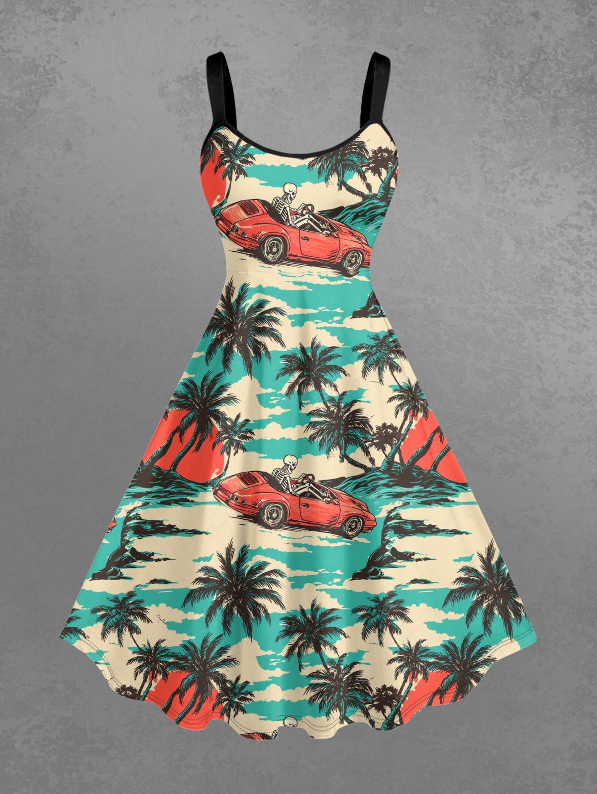 Gothic Plus Size Coconut Tree Car Skeleton Print A Line Dress