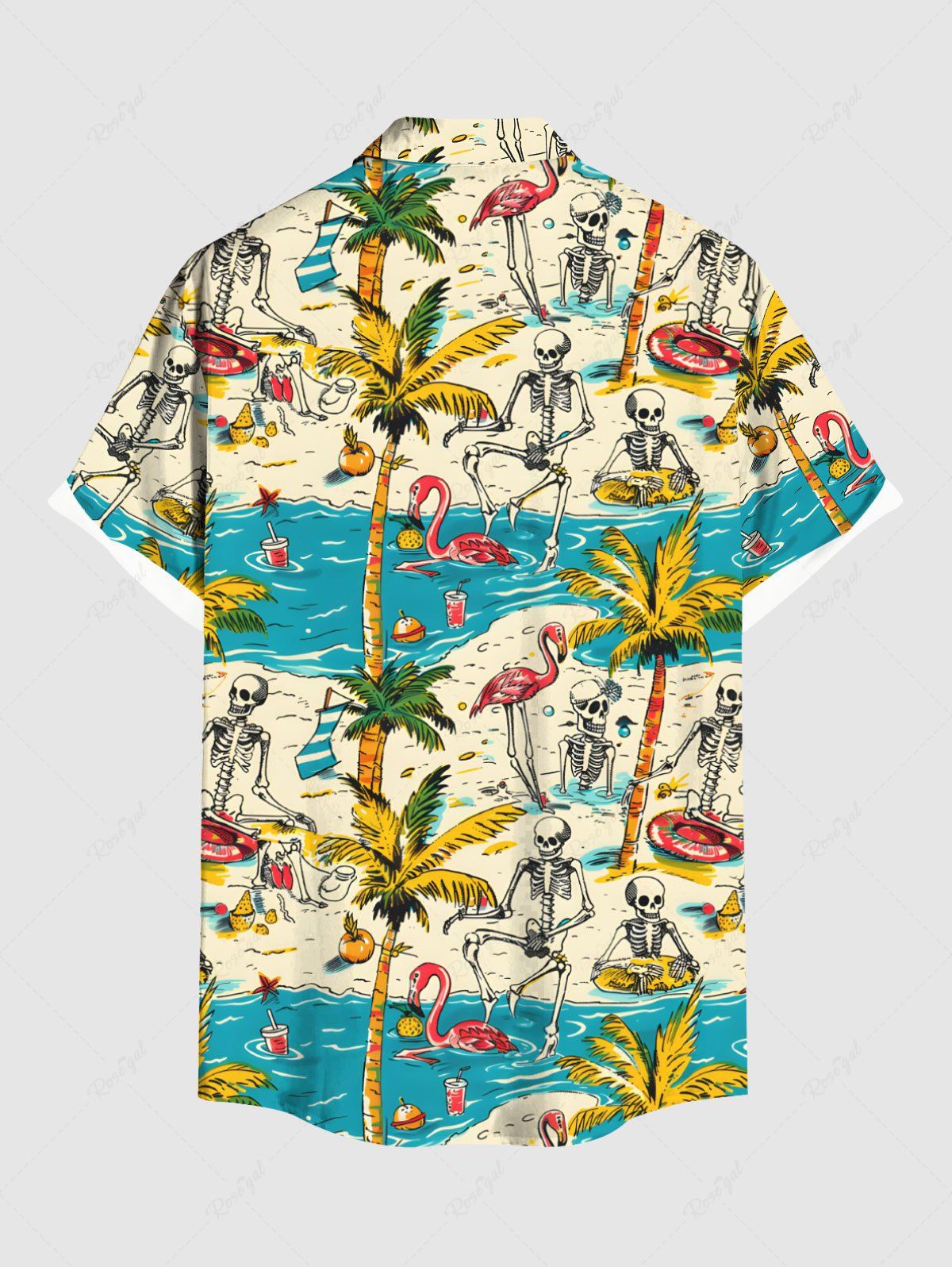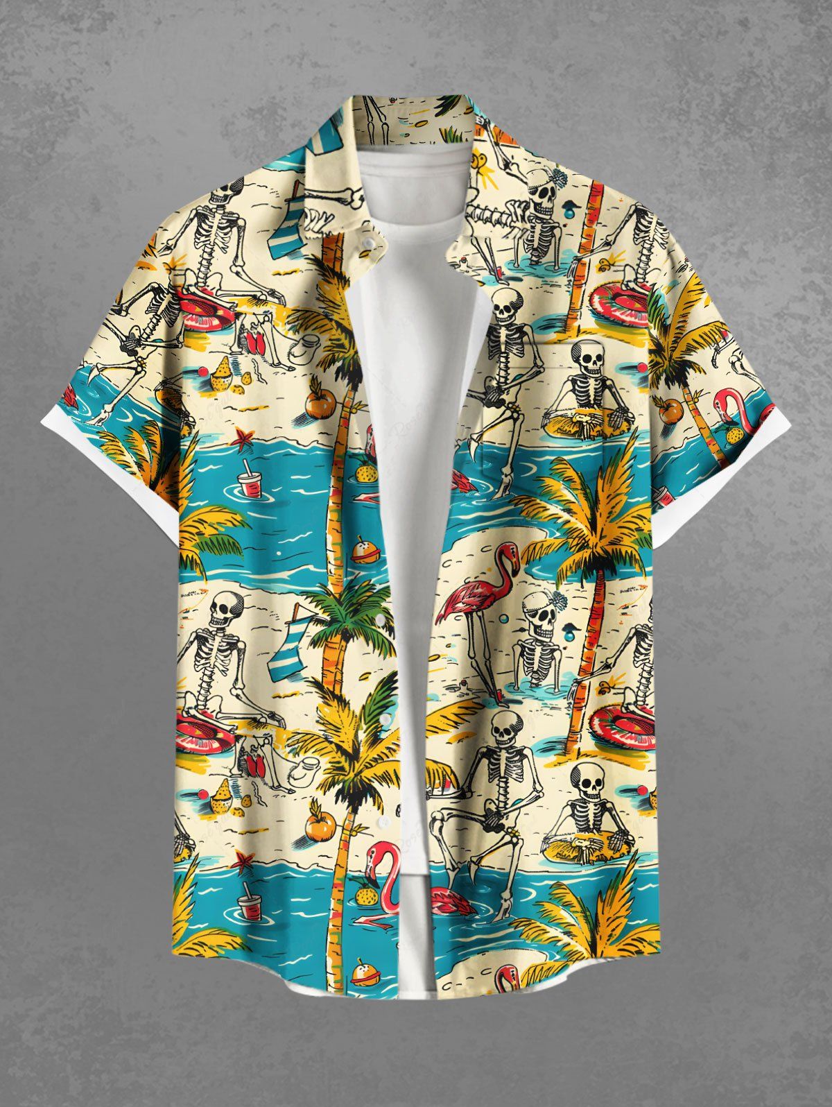 Gothic Plus Size Coconut Tree Flamingo Skeleton Sea Beach Print Hawaii Button Pocket Shirt For Men