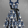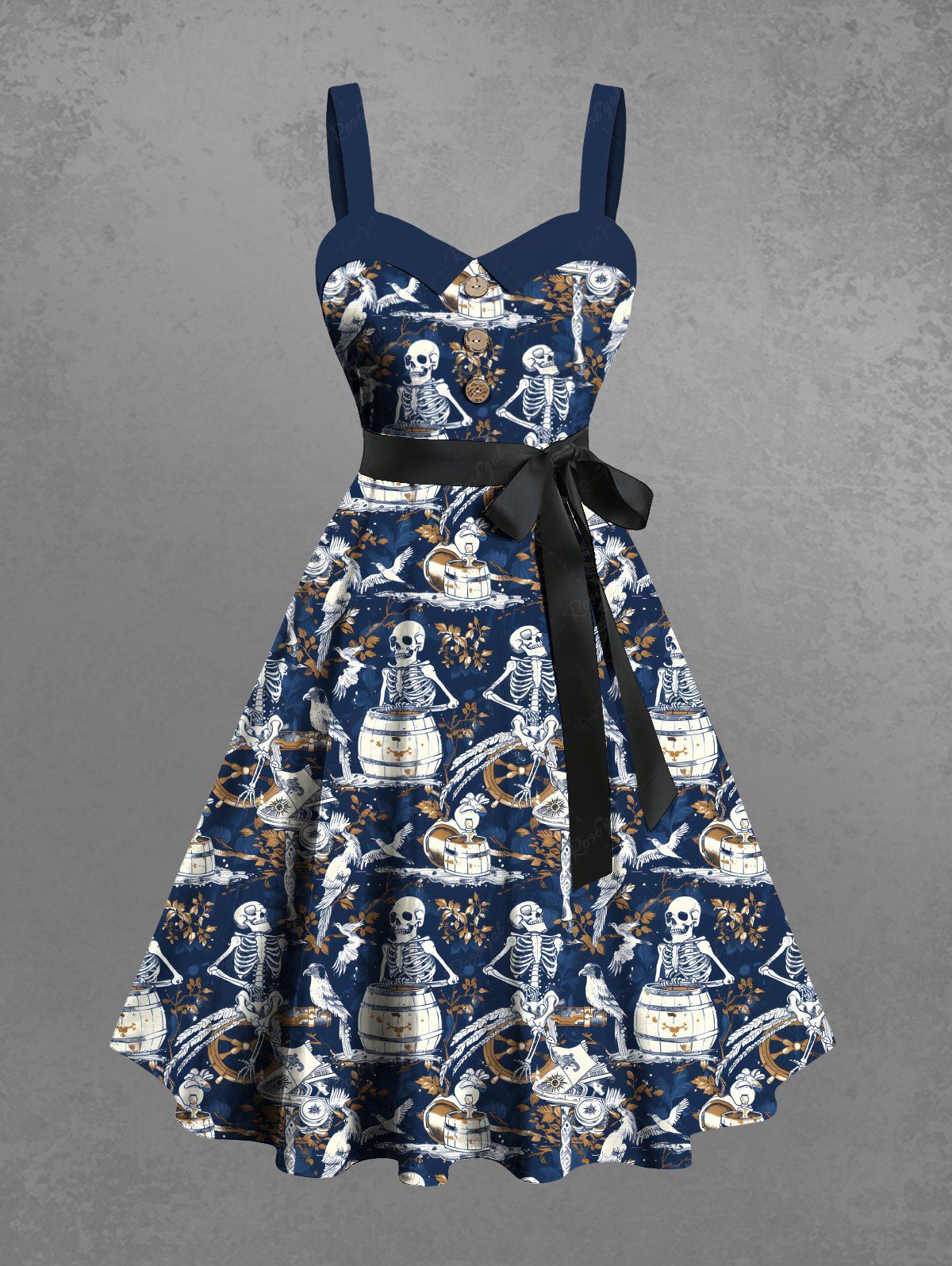 Gothic Plus Size Skeleton Bird Wooden Cask Print Button A Line Dress with Removable Belt